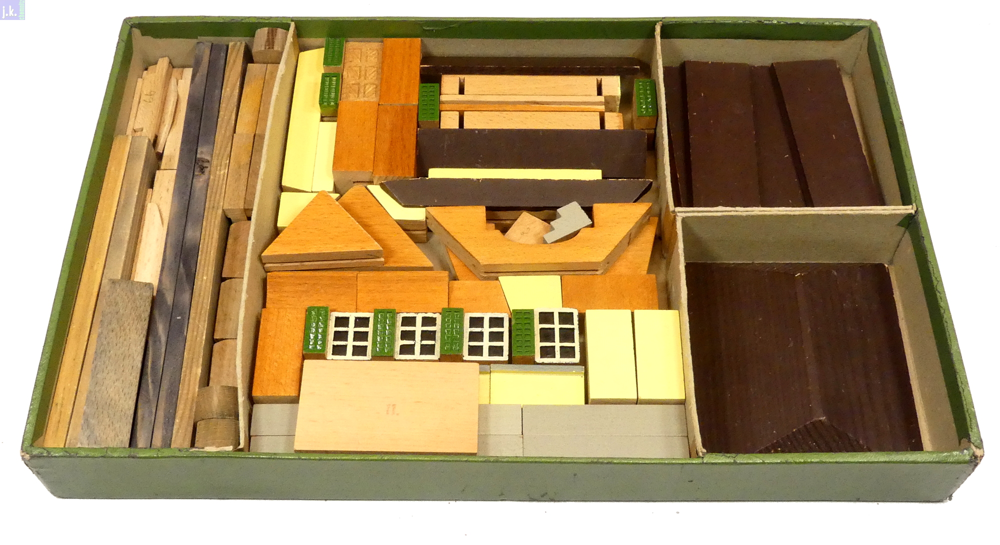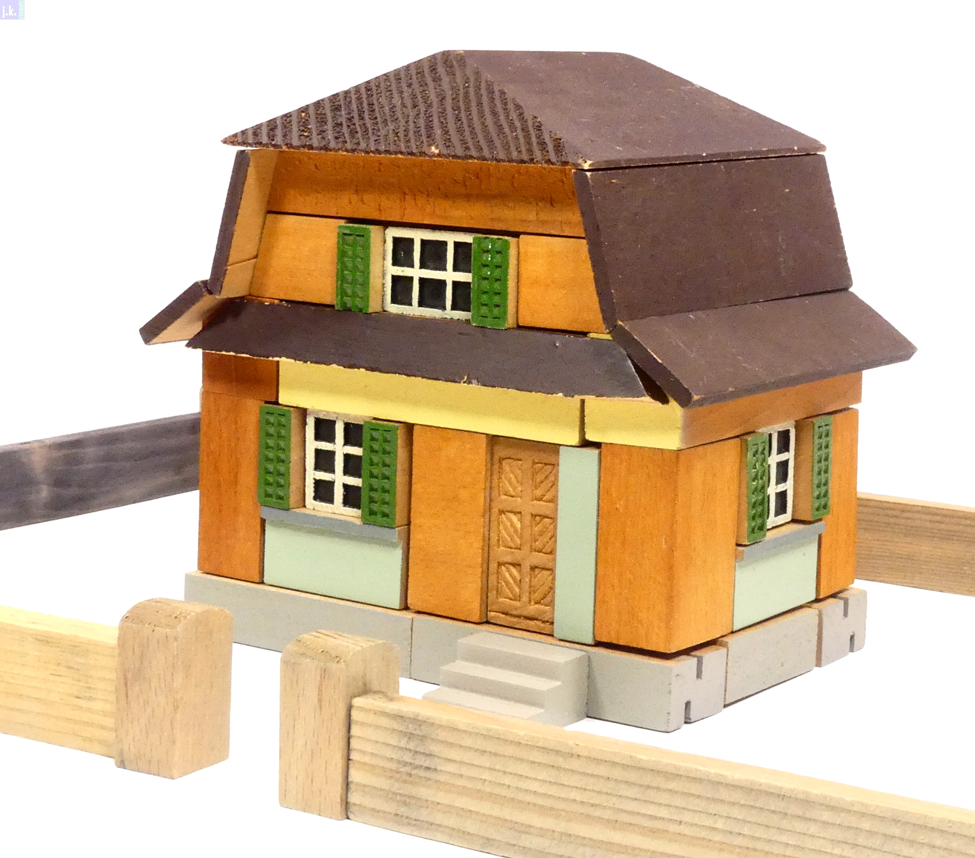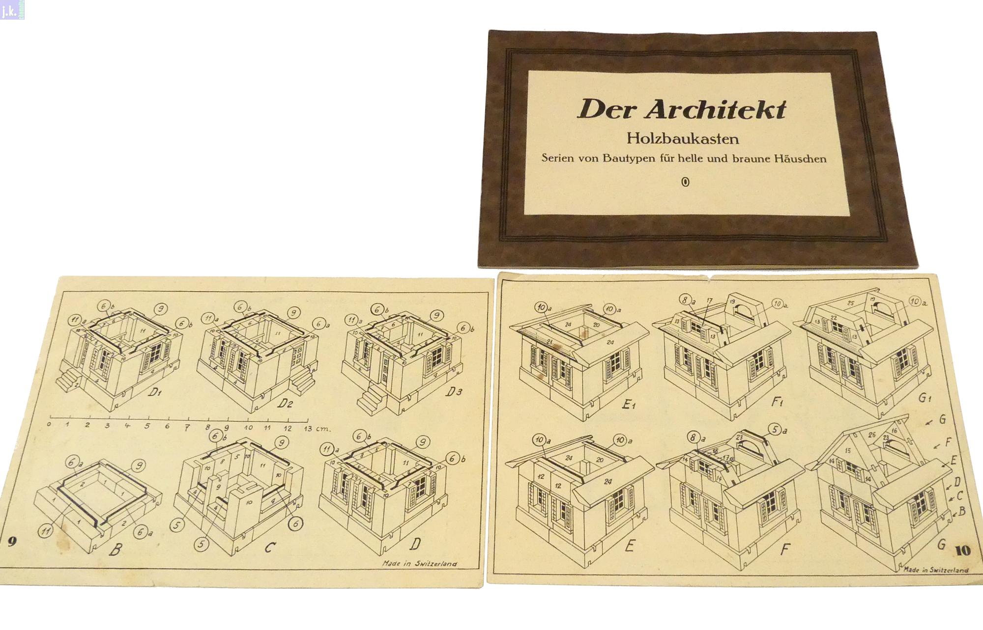 Bemerkungen Schweizer Architekturbaukasten aus farbigen Buchenholzbausteinen, Dächer und Zäune Nadelholz, wobei die Grundkörper im Nut-Feder-Prinzip aufgebaut werden, die Dächer und Anbauten aber nur aufgelegt / aufgestellt sind.