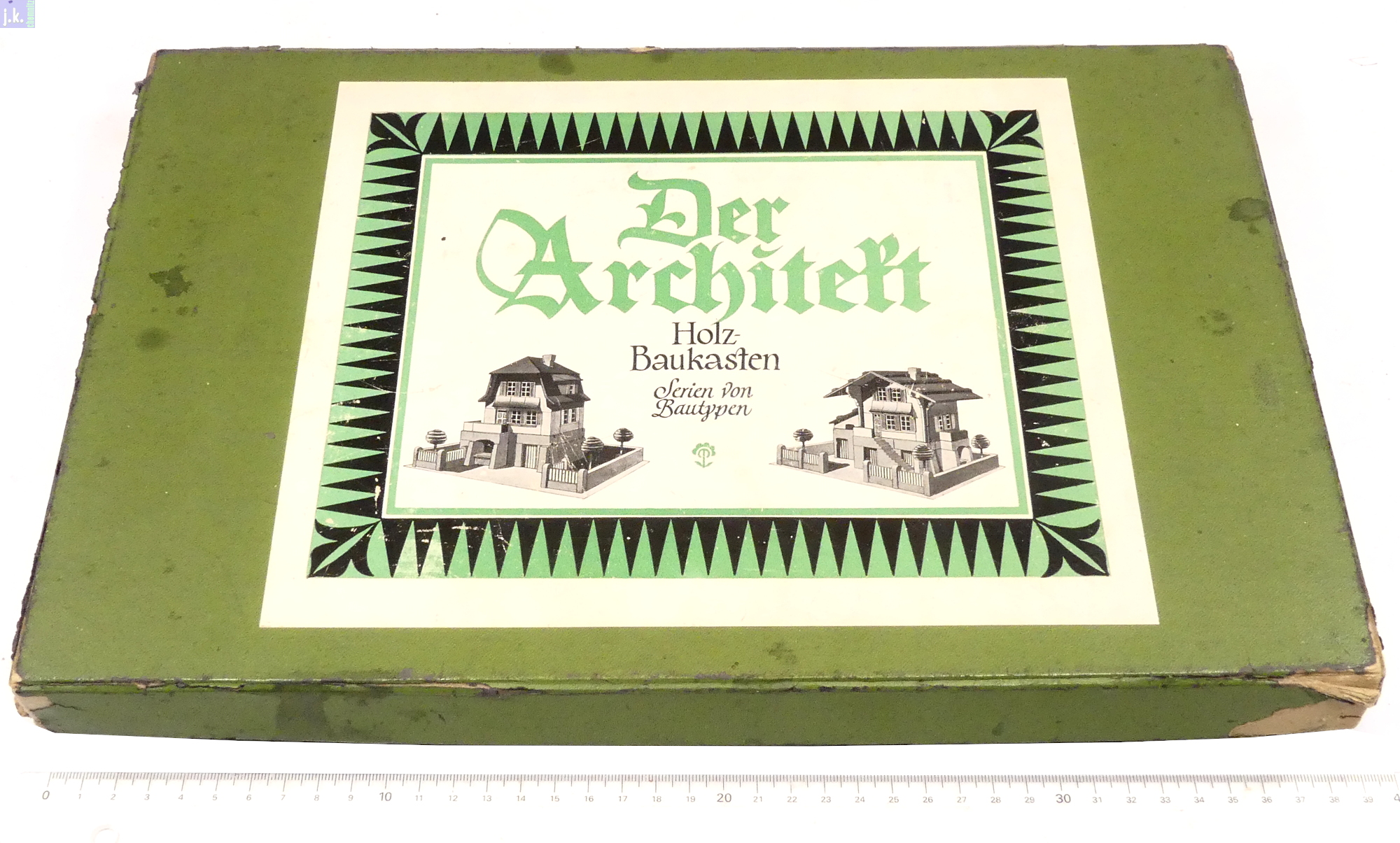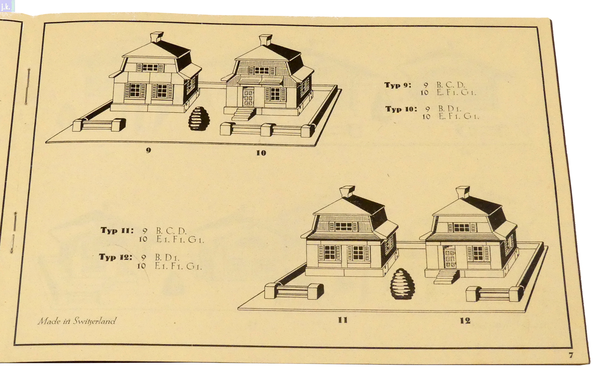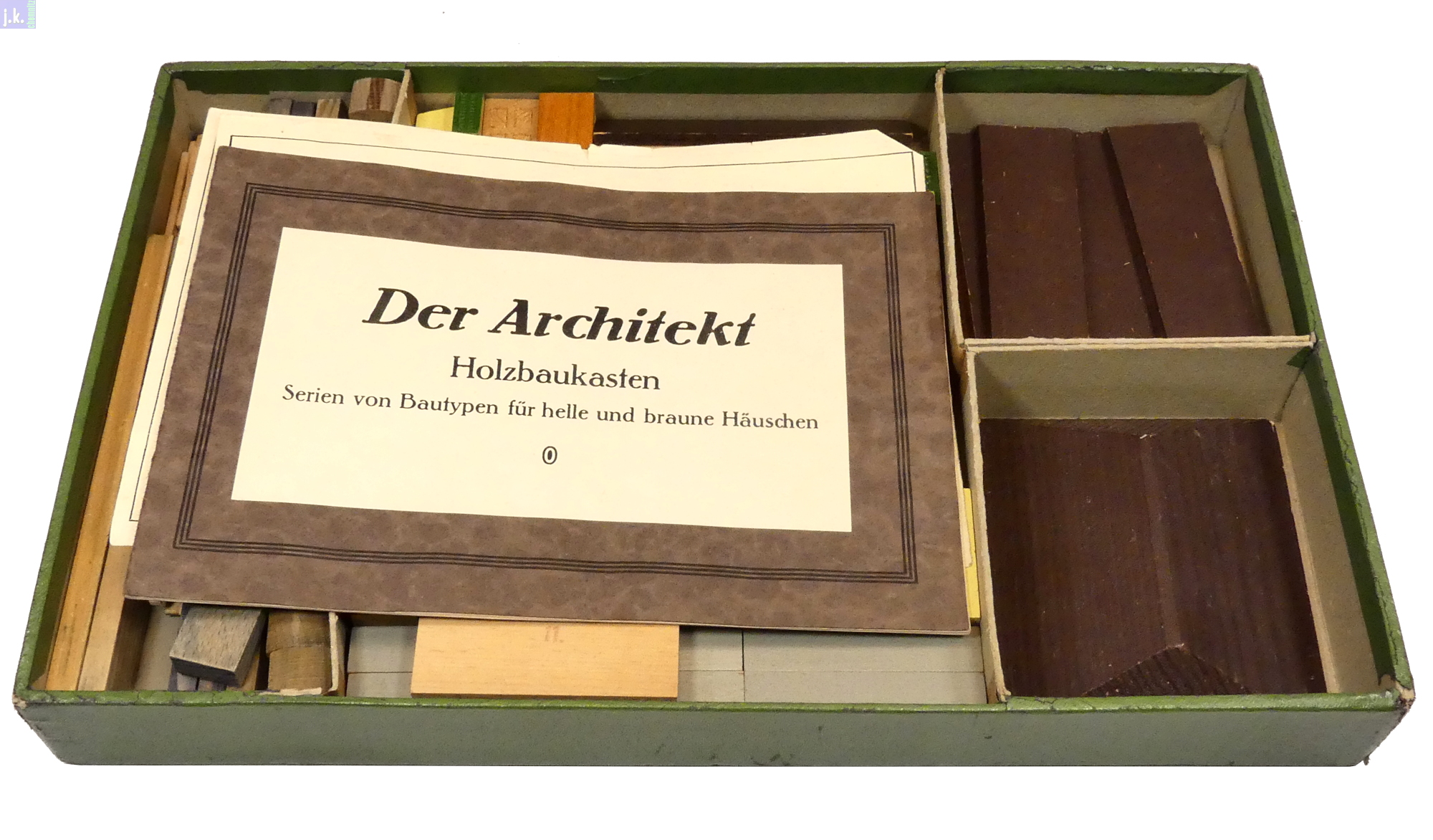 Bemerkungen Schweizer Architekturbaukasten aus farbigen Buchenholzbausteinen, Dächer und Zäune Nadelholz, wobei die Grundkörper im Nut-Feder-Prinzip aufgebaut werden, die Dächer und Anbauten aber nur aufgelegt / aufgestellt sind.