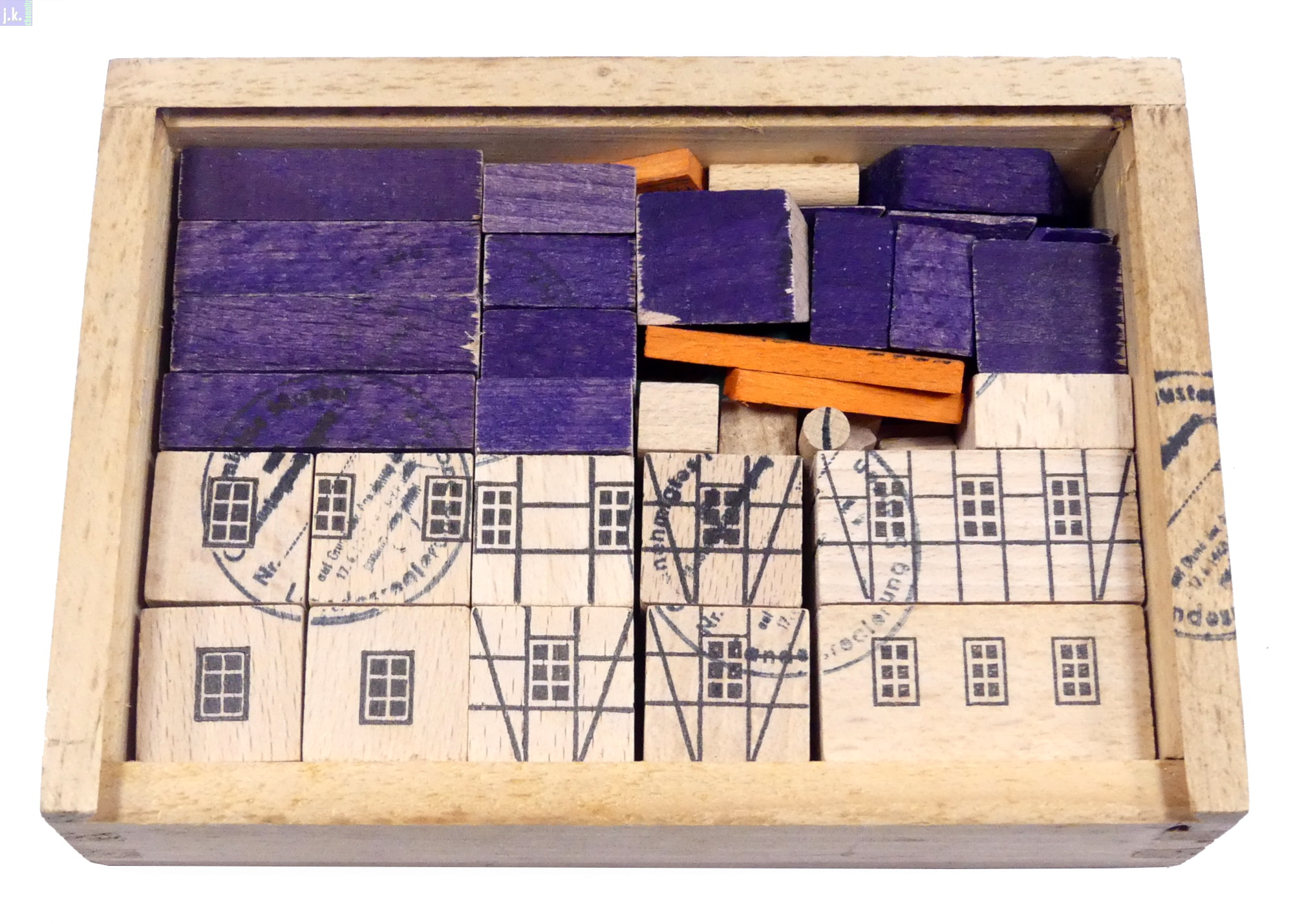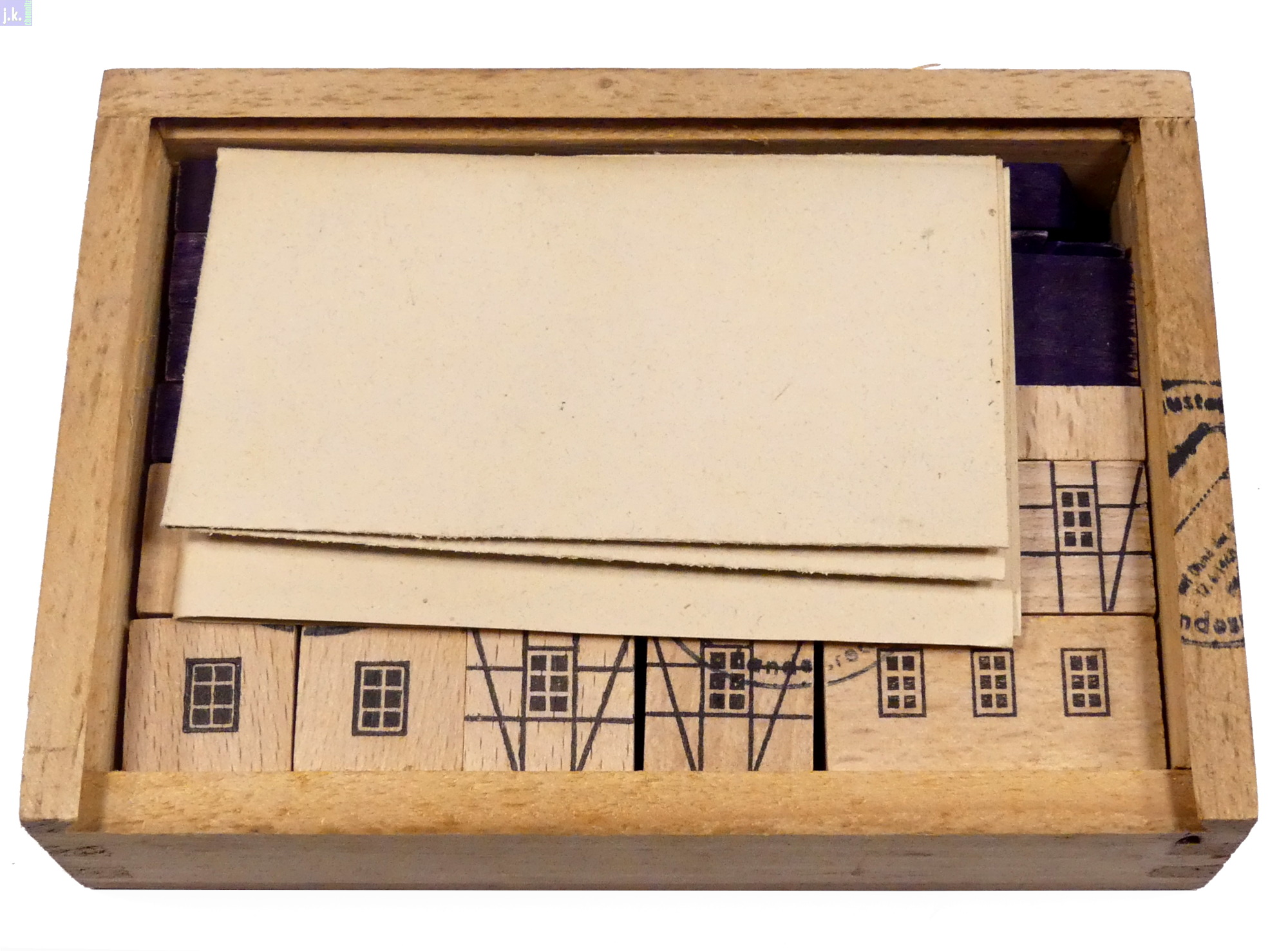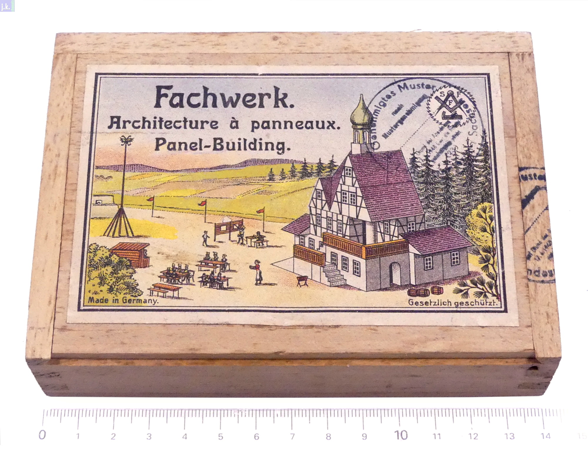Kleinste Nachkriegsausrüstung Nr. 3121 des Fachwerk-Baukastens. Dabei ein Vorlagenblatt 24 cm x 20 cm. Die Holzkiste ist ungebeizt - warum?