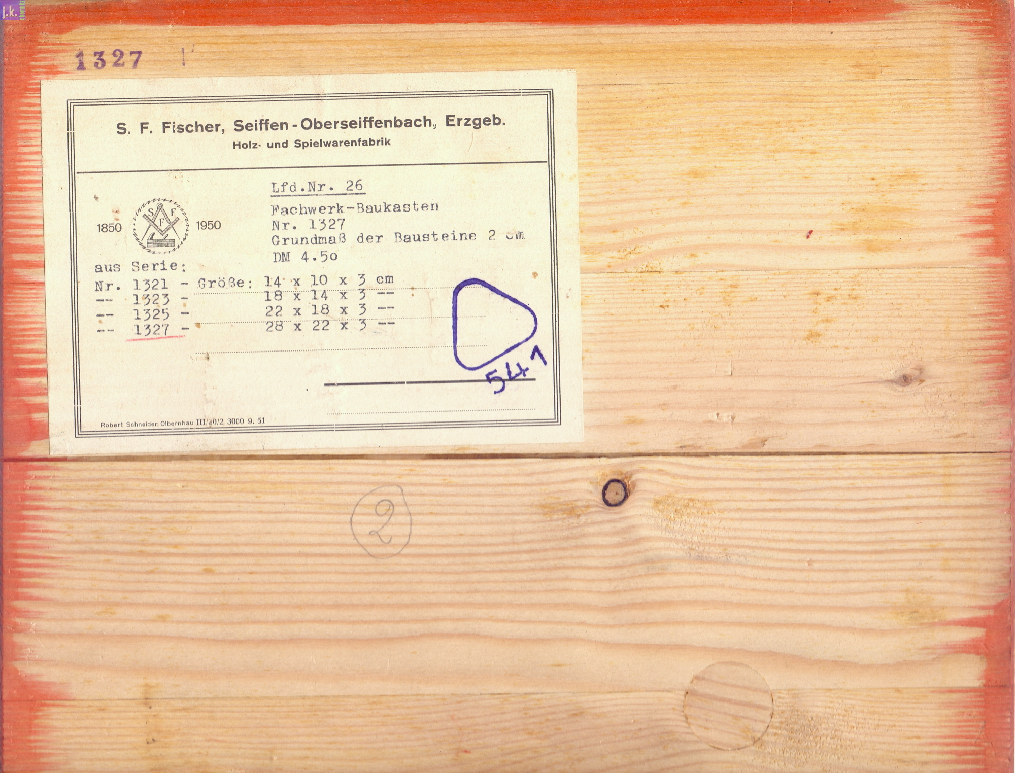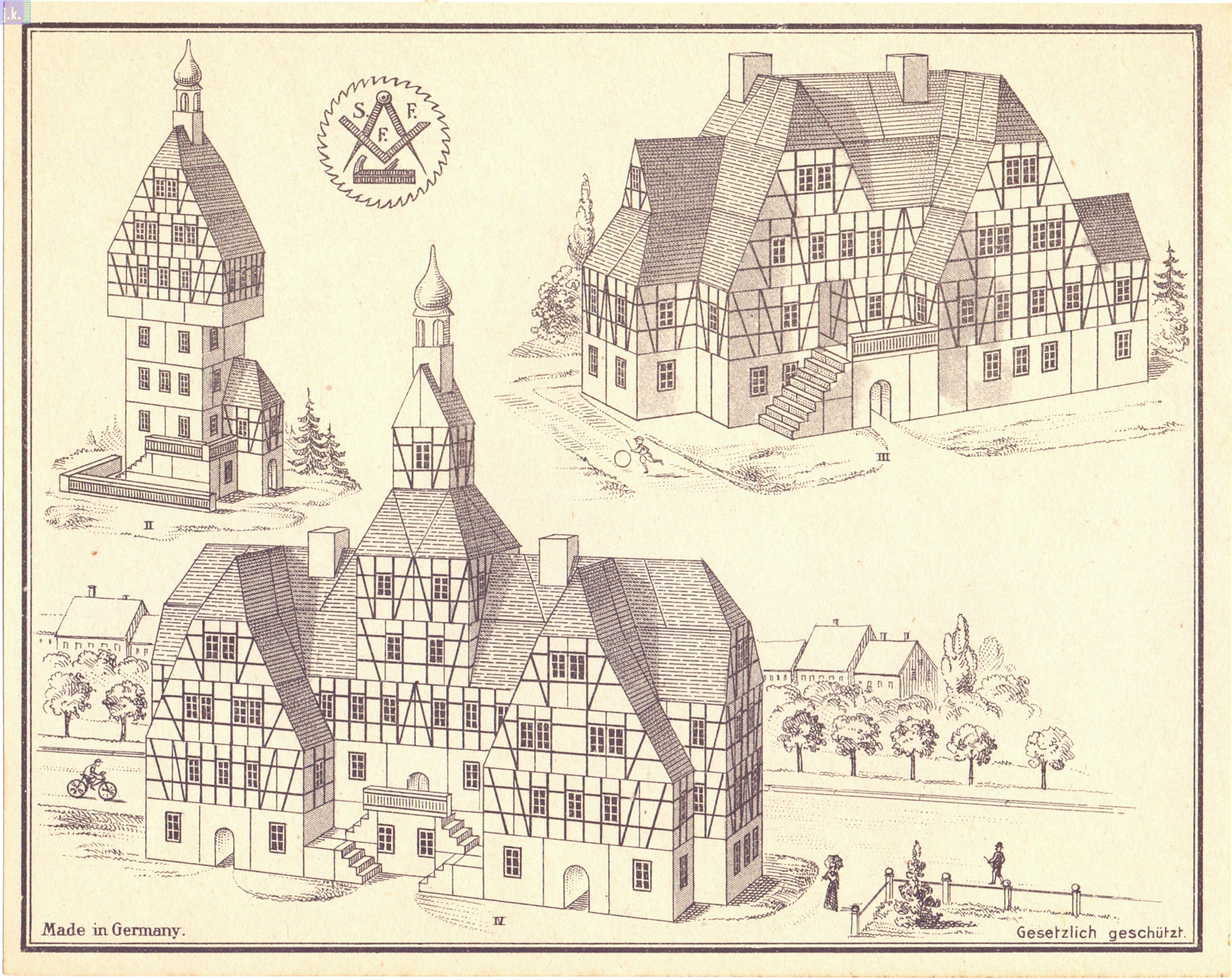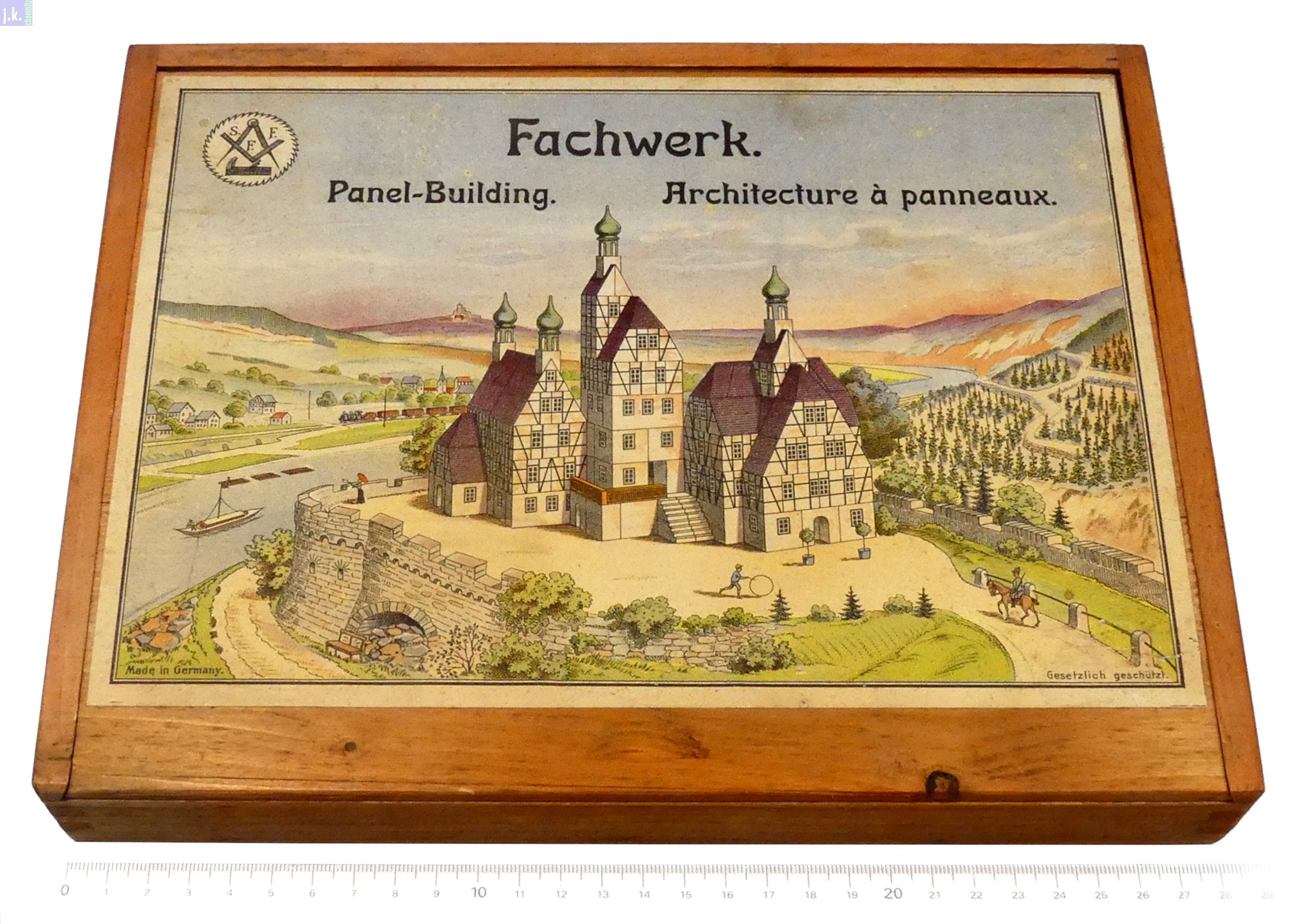 Bemerkungen Der größte Fachwerk-Baukasten, Nachkriegs-Katalog-Nr. 1327 (VK: 327, da gab es noch einen größeren, den 328). Auf vier Blättern ist für reichlich Bauvorlagen gesorgt (20 cm x 16 cm (Bild 5), 20 cm x 16 cm (Bild 6), 24 cm x 16 cm (Bild 7), 32 cm x 24 cm (Bild 8)). Sie dürften noch aus Vorkriegsbeständen stammen.