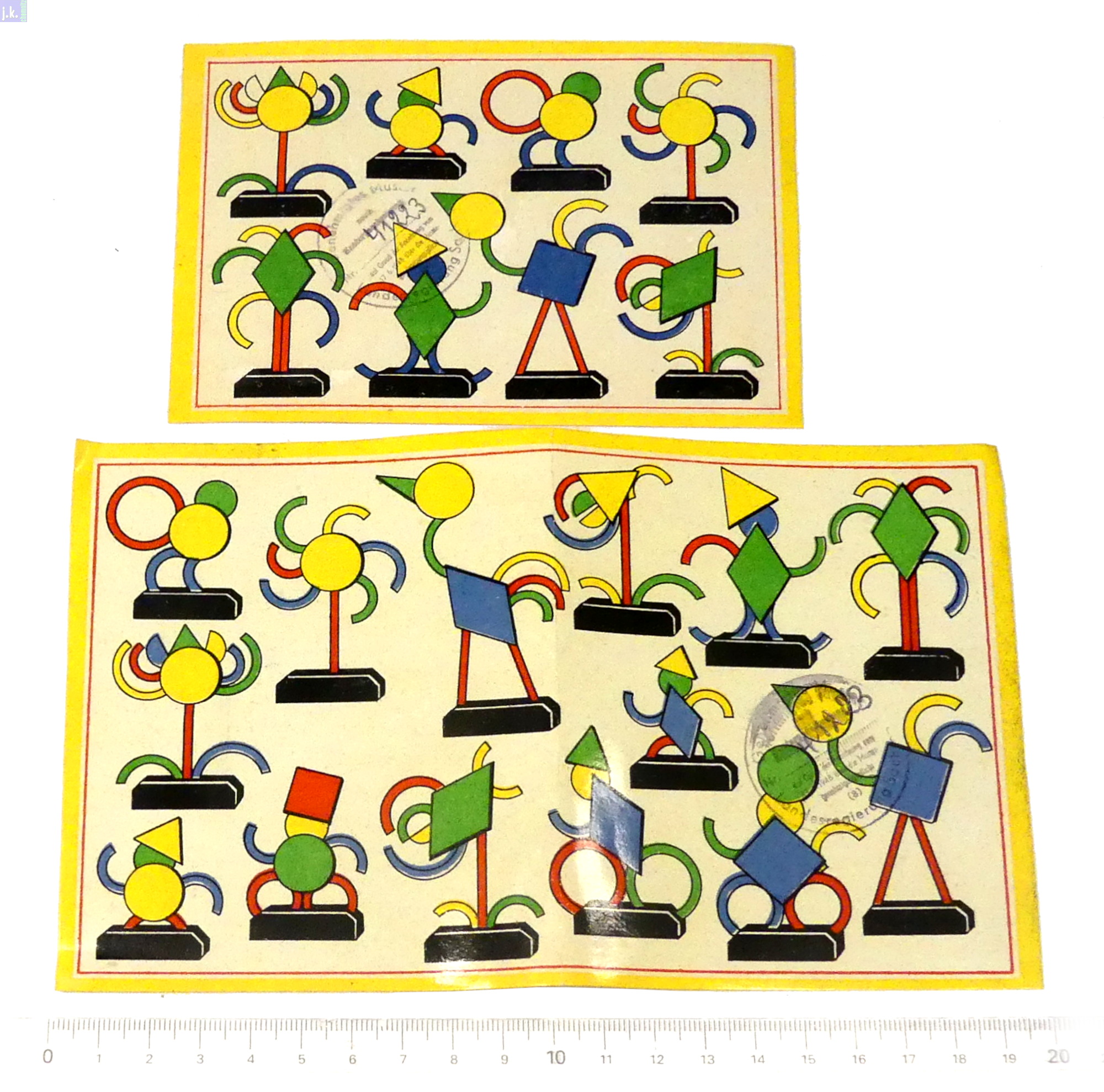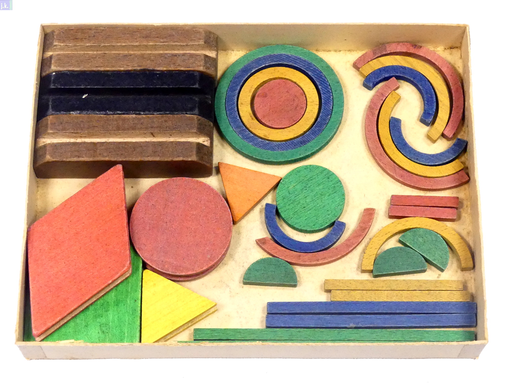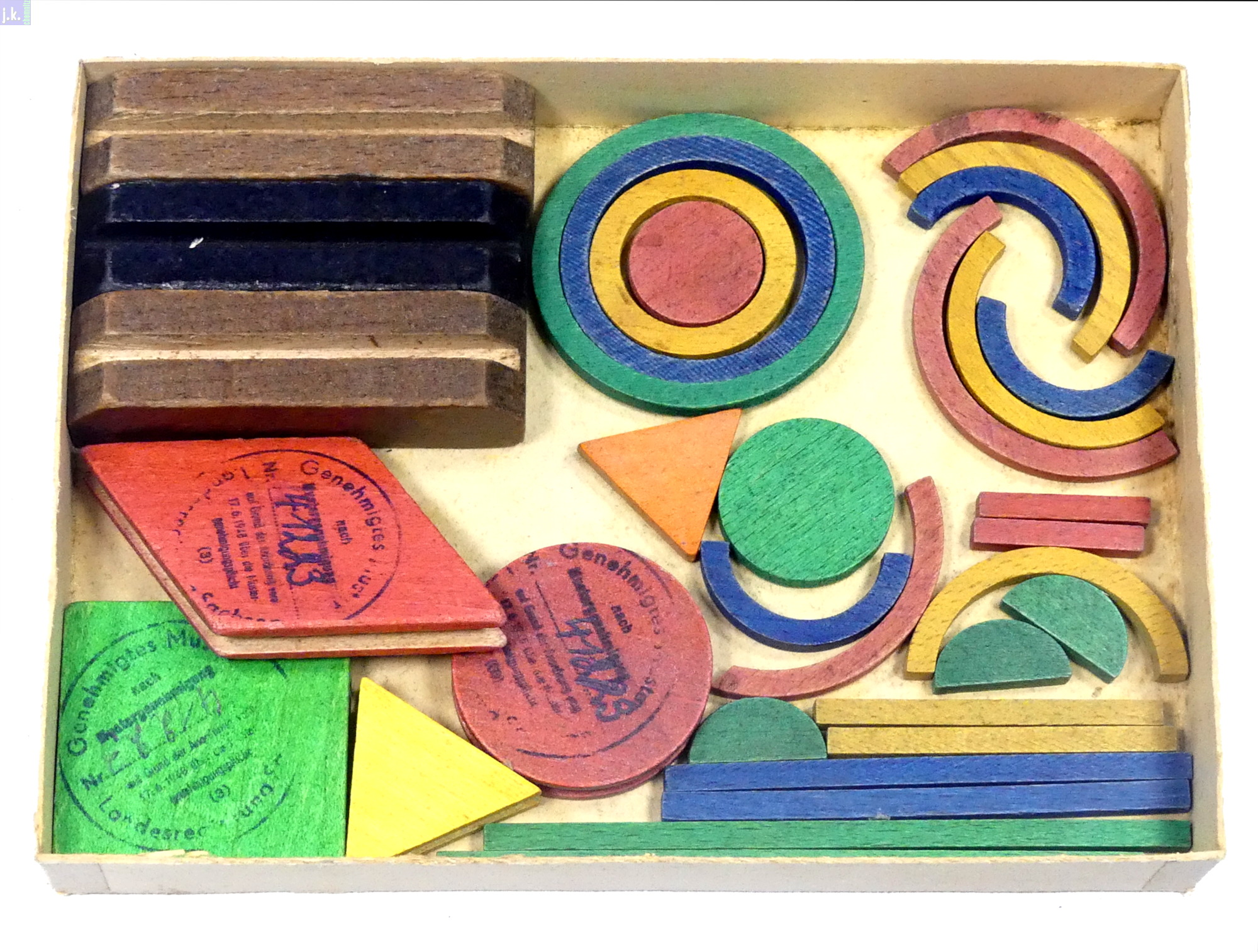 Zustand: unbespielt, vollständig. Mustergenehmigungsstempel auf Bausteinen, Vorlagen und dem Deckel. Farben der Bausteine deutlich verblasst. Passungen mittlerweile eher schlecht.