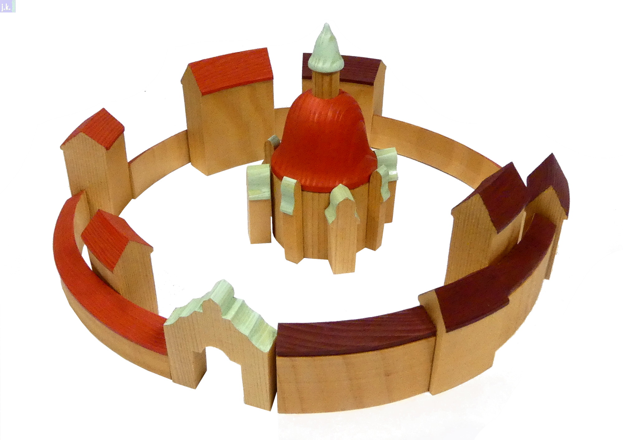 Bemerkungen Teile aus Fichtenholz zum Aufbau eines Frauenkirche-Ensembles. Bis auf die eigentlichen Kirchenteile sind alle Teile reifengedreht. Die Kästen dürften in der Seiffener Gegend hergestellt worden sein - Reifendrehwerke gibt es nicht mehr viele.