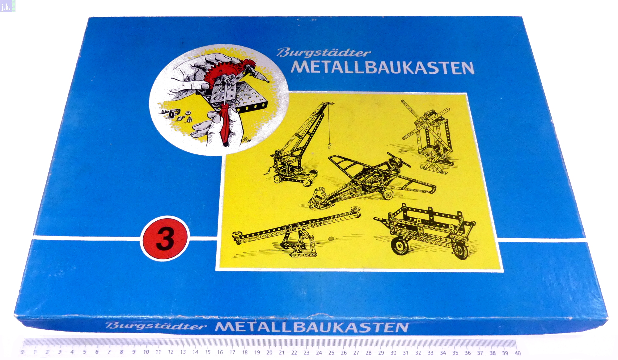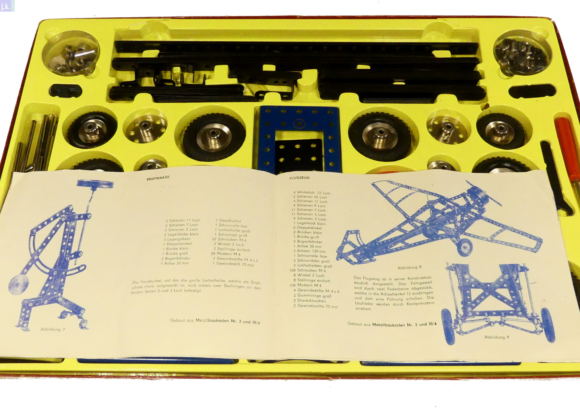 Zustand: Leicht bespielt, bis auf die fehlenden Schrauben und Muttern vollständig aufgefüllt (4 Teile). Vorlagenheft stark benutzt. Eine Deckelecke repariert. Tiefzieheinsatz mit diversen Rissen.