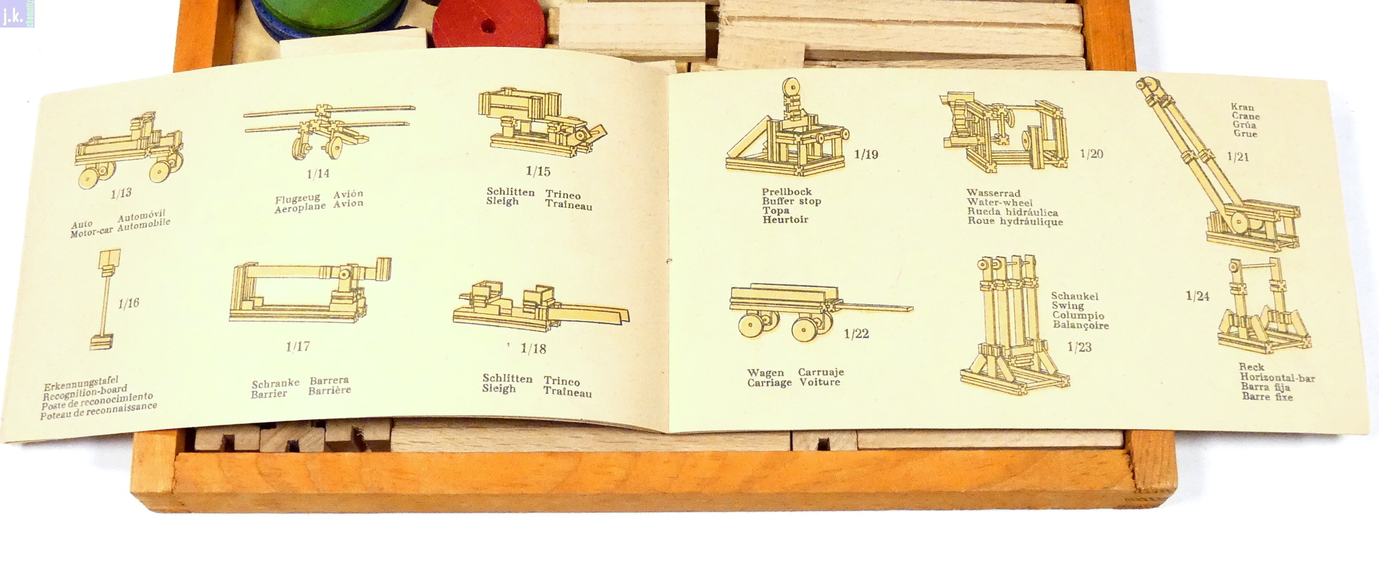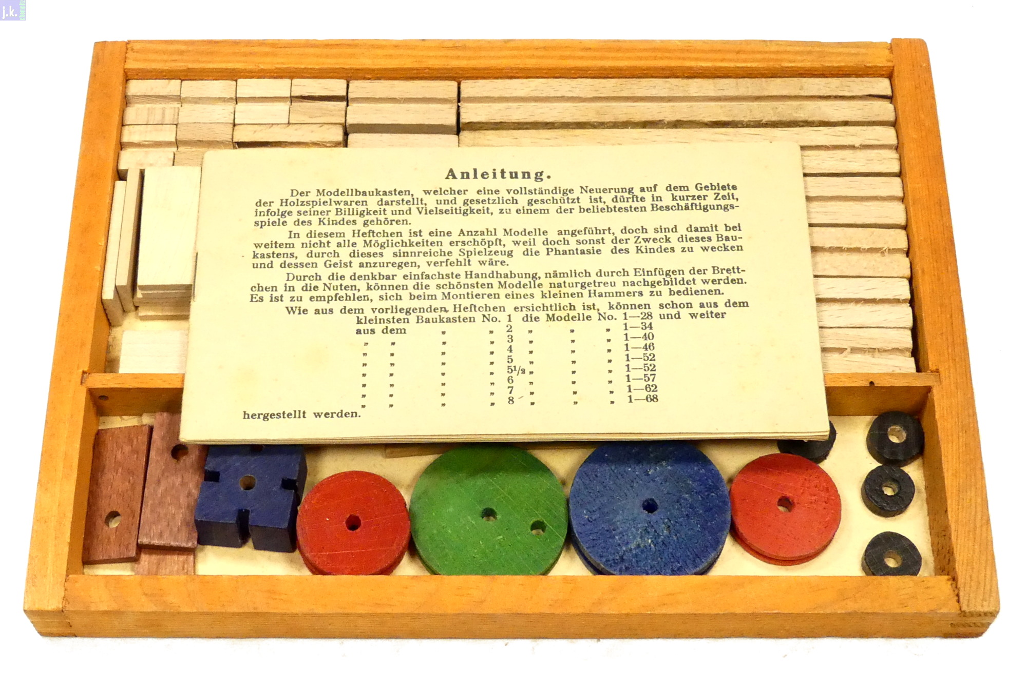 Zustand: wohl unbespielt, nicht vollständig. Benutzte Holzachsen beigelegt. Kartonboden mit Leck. Ramponierter Deckel neu aufgebaut (Bild 6). Vorlagenheft ohne Umschlag (Bild 2).