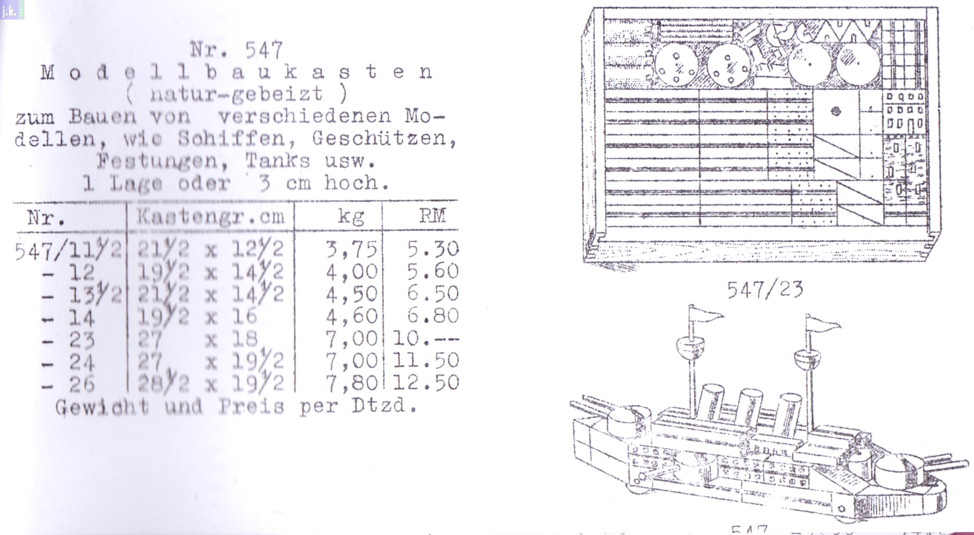 Im Zusatz zu Preisliste K wird ein 'Modellbaukasten' Nr. 547 angekündigt, der aber eher wie ein Festungsbaukasten beschrieben wird (und auch so aussieht Bild 7). In späteren Jahren taucht die Nummer für einen anderen Baukästen wieder auf.