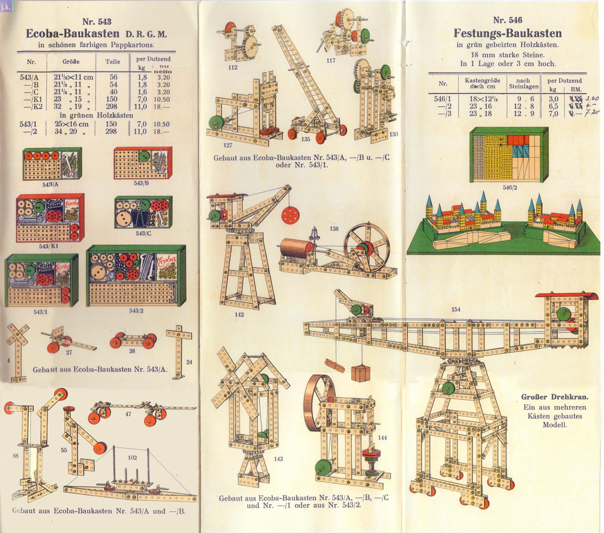 Bemerkungen Baukasten Nr. 543/2 aus Hartholz- und (weniger) Metallteilen. Offenbar war der Kasten als eine parallele Weiterentwicklung des Modell-Baukastens der Serie 542 gedacht. In der Preisliste Preisliste J wohl erstmals enthalten - auf 2 1/2 Seiten (Bild 6)!. Er wurde in fünf verschiedenen Größen (A, B, C (diese nur in Kartons), Nr. 1 und Nr. 2) angeboten und auch nach dem Kriege noch produziert (Serie 43). Apostrophiert als 'Metallbaukasten des kleinen Mannes' soll er recht weit verbreitet gewesen sein.