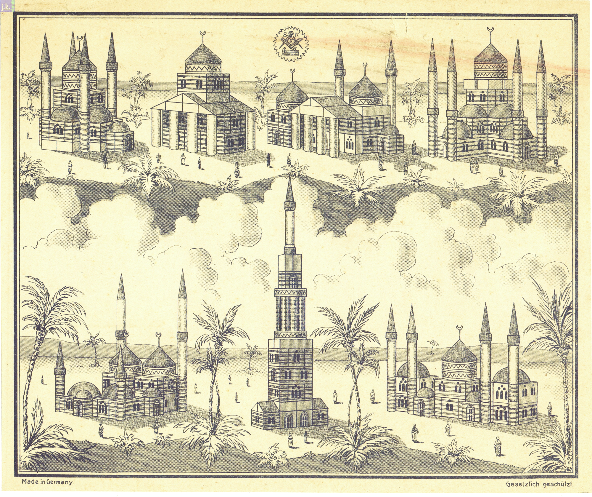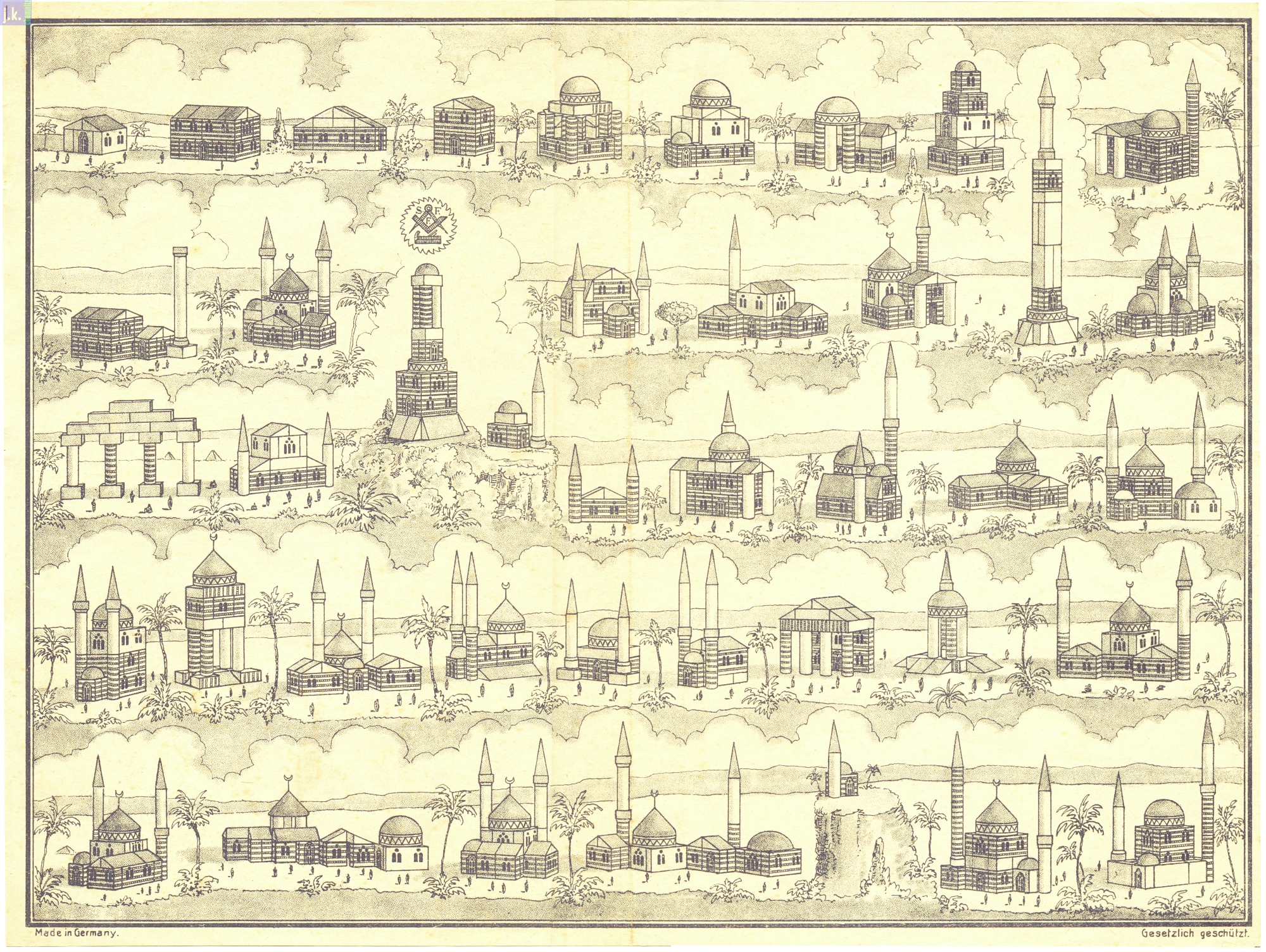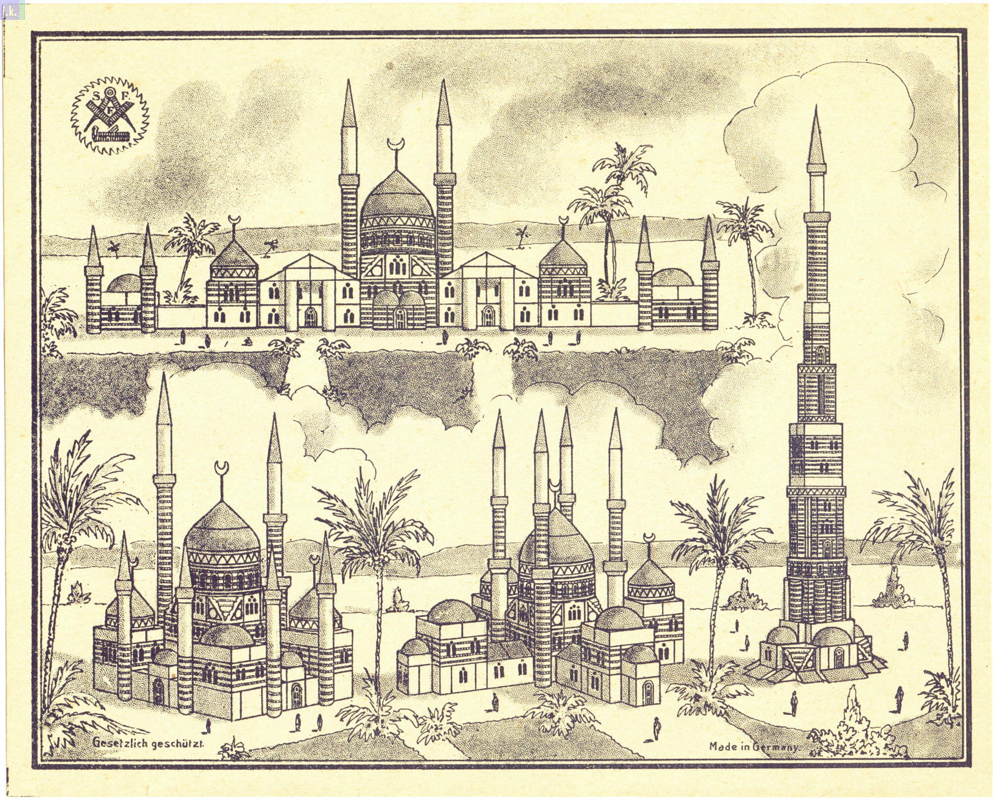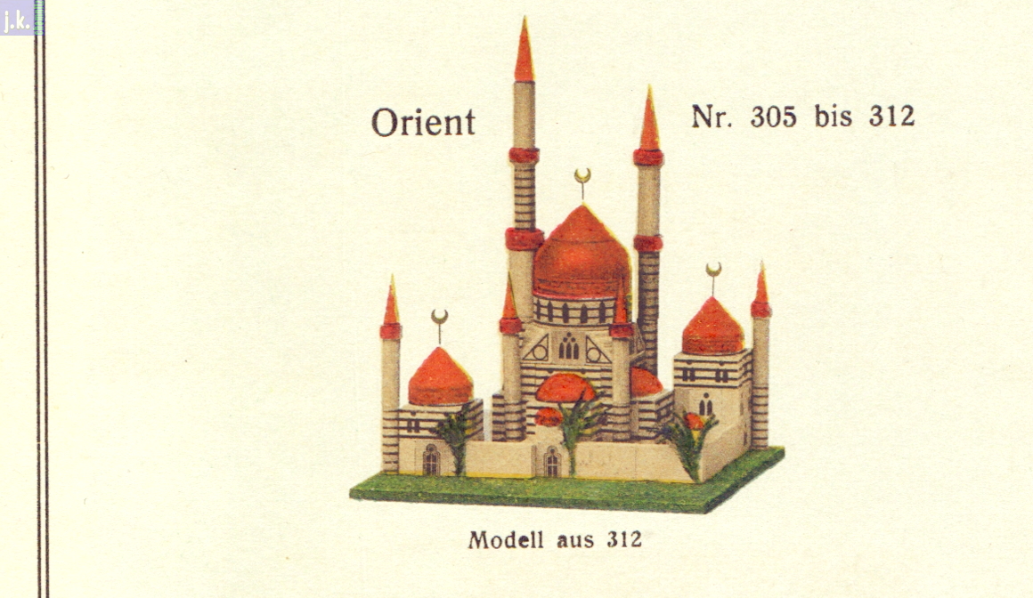 Bemerkungen Der größte Orient-Baukasten Kat.-Nr. 312. Dazu gibt es vier Vorlagenblätter mit unzähligen Bauvorlagen und drei Hilal (Sichelmonde) 'am Stiel', die aus Messing bestehen (Bild 2, mitte - rechts).
