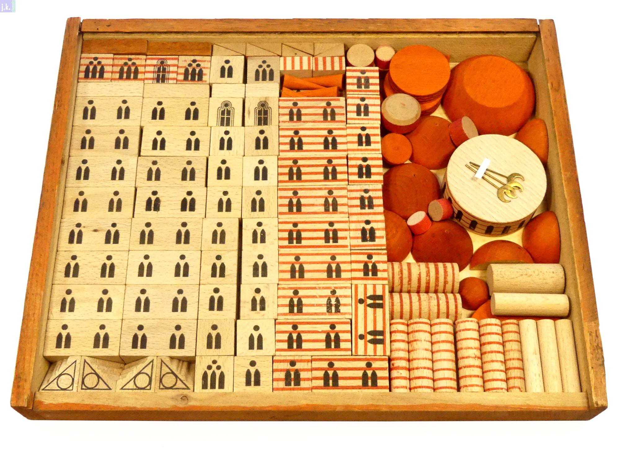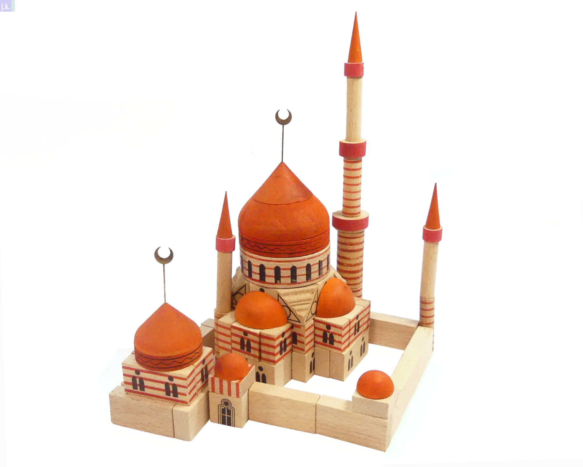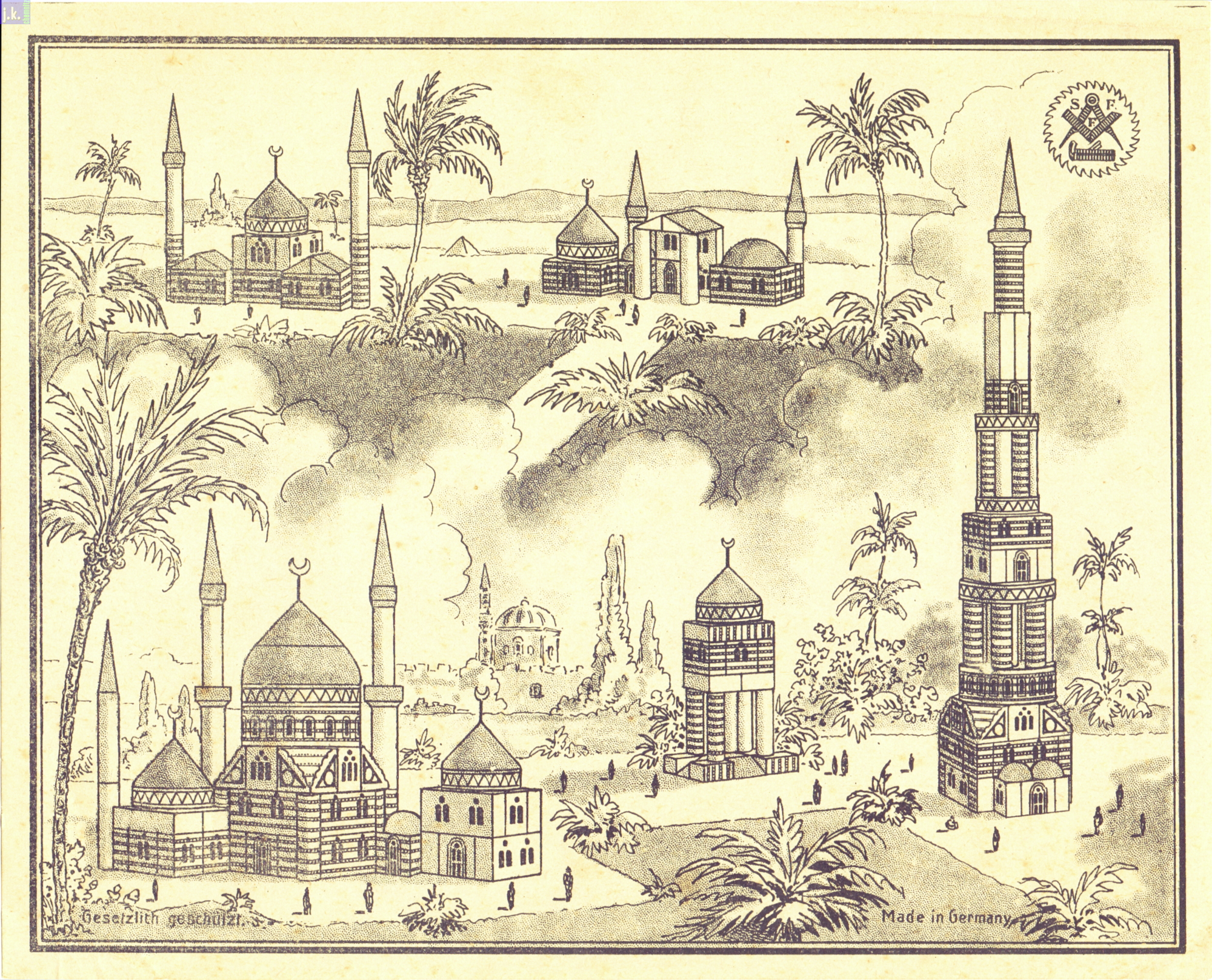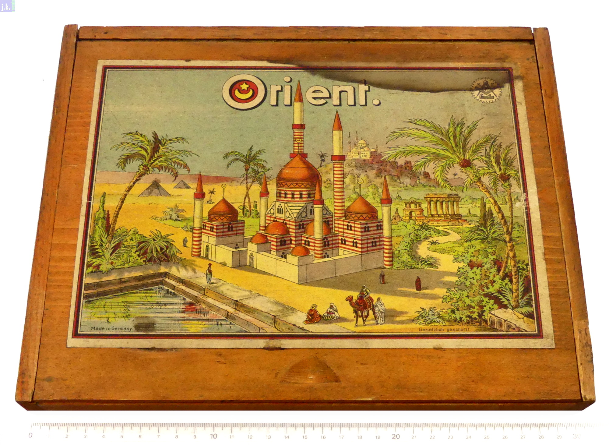 Bemerkungen Der größte Orient-Baukasten Kat.-Nr. 312. Dazu gibt es vier Vorlagenblätter mit unzähligen Bauvorlagen und drei Hilal (Sichelmonde) 'am Stiel', die aus Messing bestehen (Bild 2, mitte - rechts).