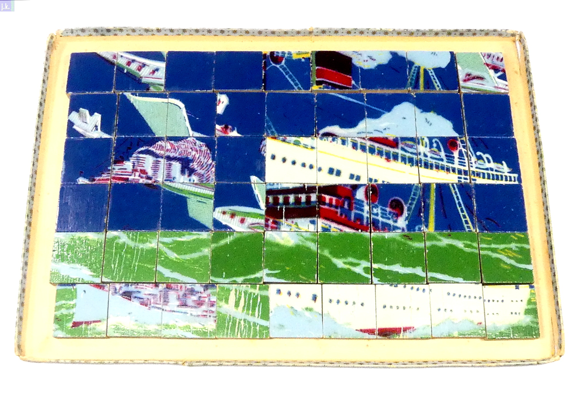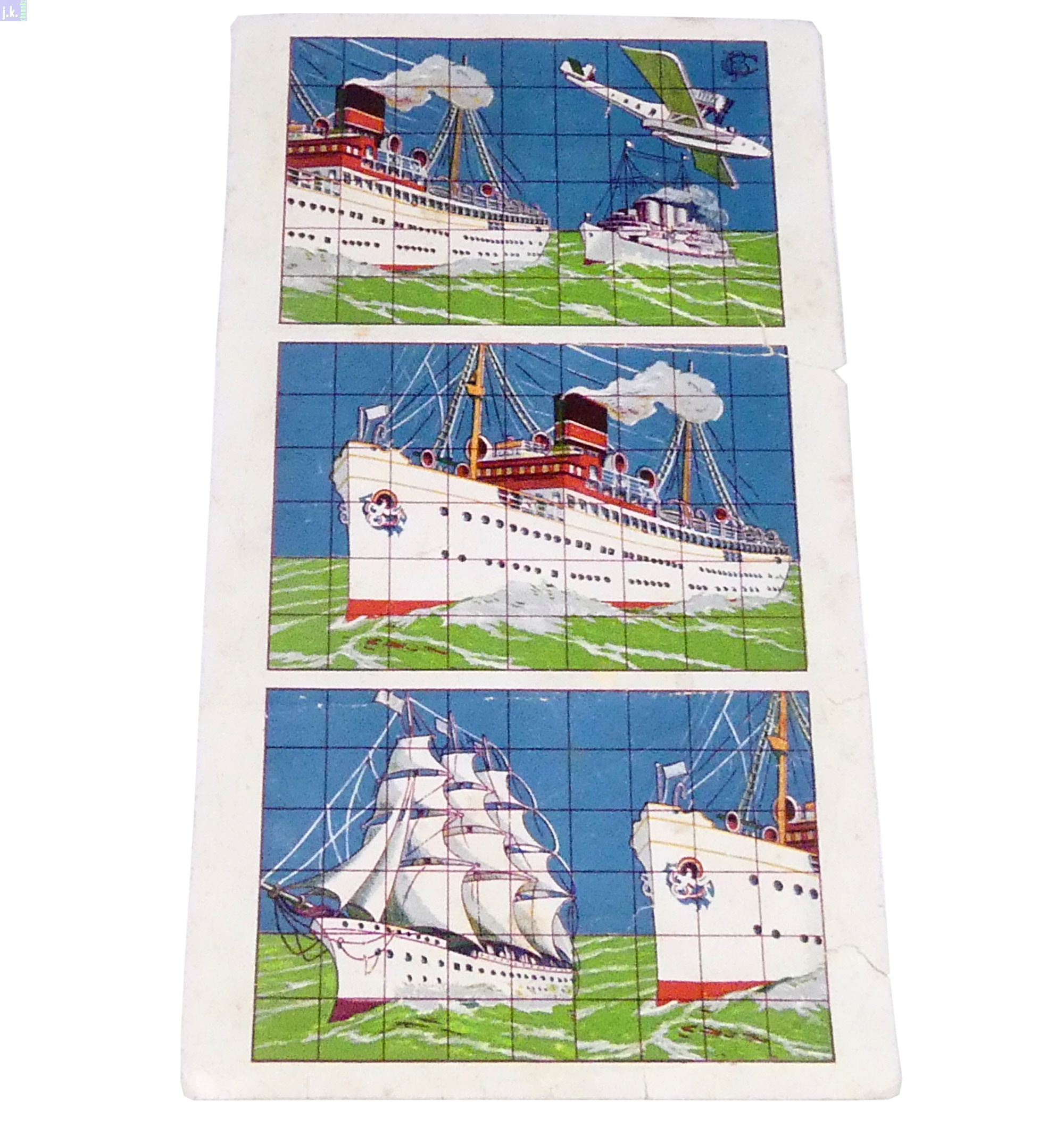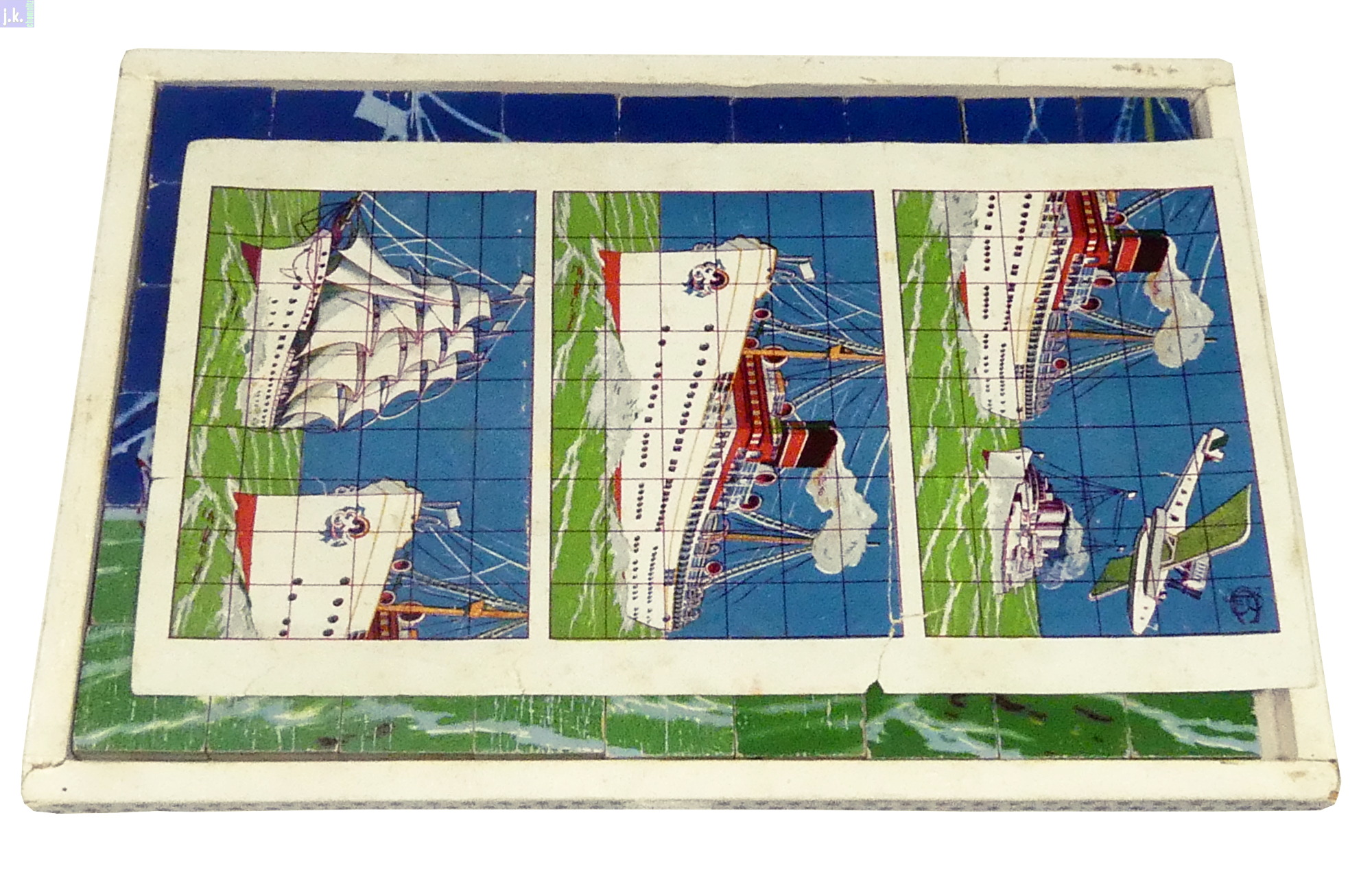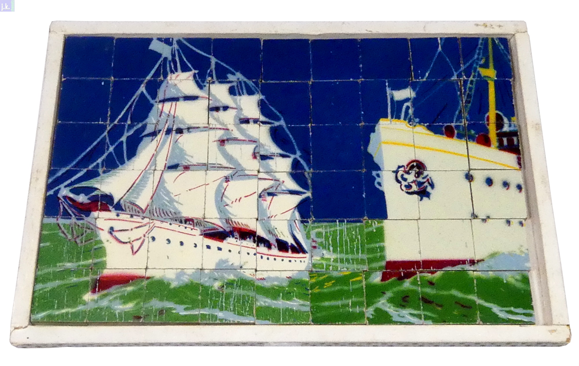 Bemerkungen Puzzle für drei Seebilder aus Hartholz, lackiert. Die drei Vorlagen zeigen verschiedene Ausschnitte des gleichen Bildes.