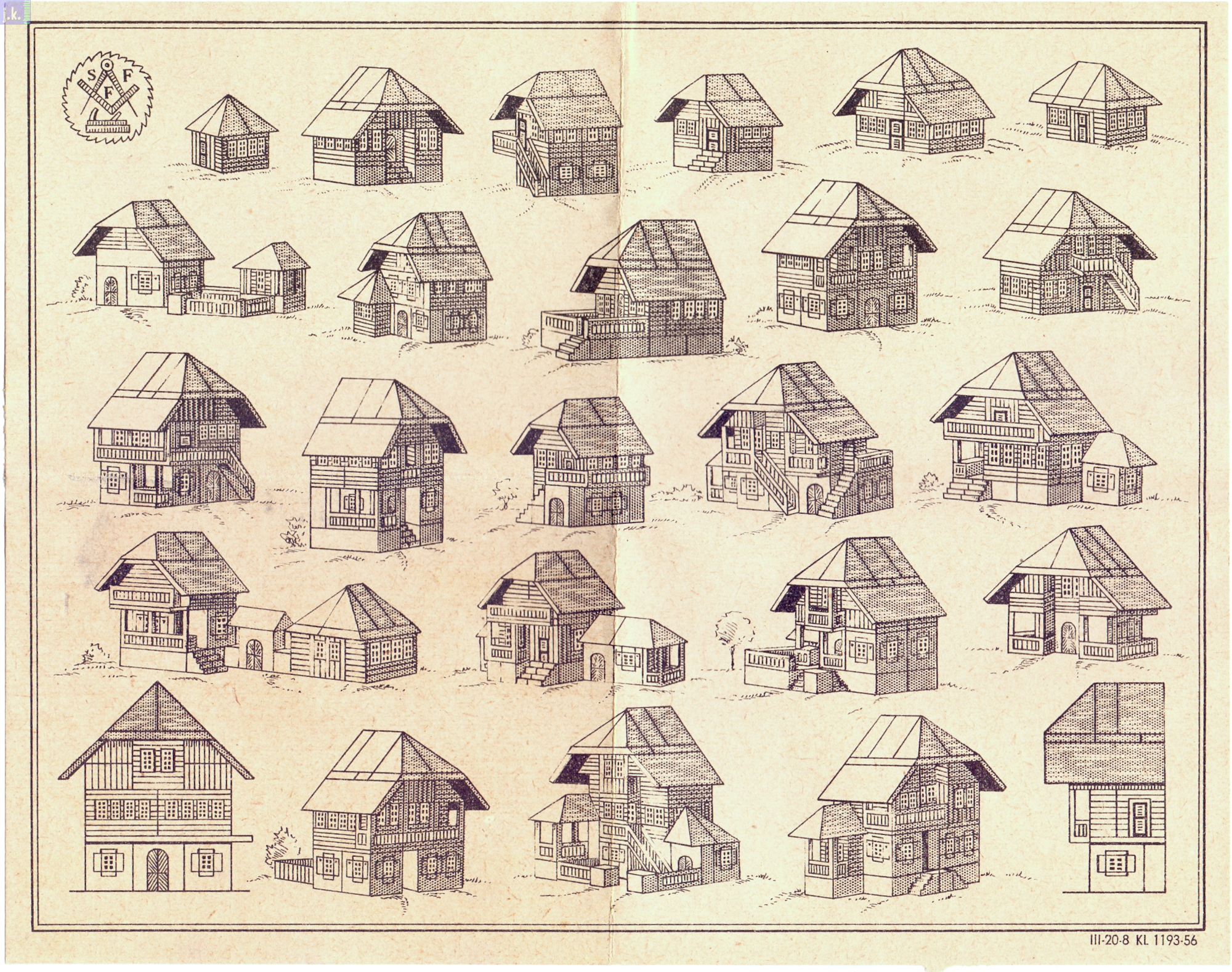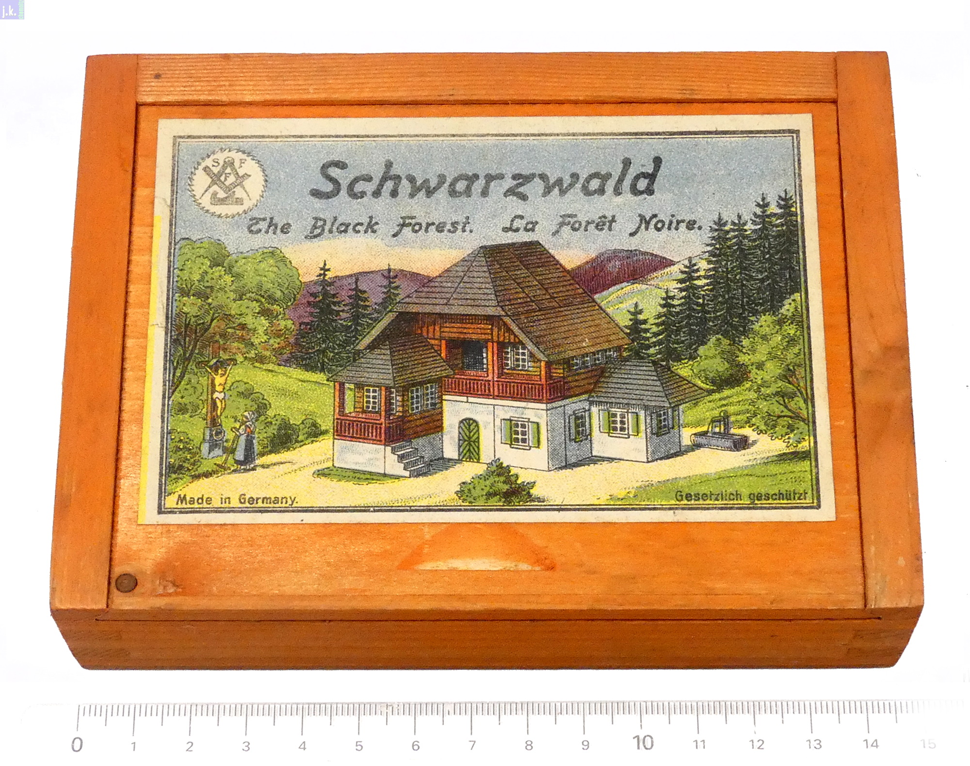 Kleinste Ausführung des Miniatur-Schwarzwald-Baukastens aus den 1950er Jahren ab 1956. Das Deckeletikett stammt noch aus Vorkriegsbeständen, das Vorlagenblatt (Druckgenehmigungsnummer III-20-8 KL 1193-56) aus der Zeit ab 1956.
