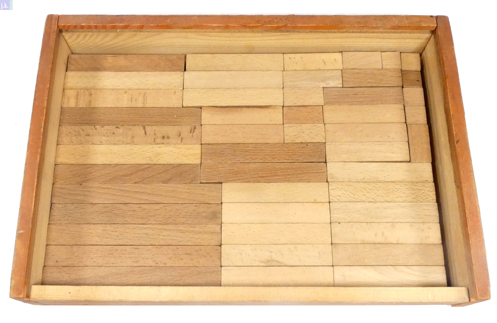 Zustand: Pro forma vollständiger, bespielter Zustand. Der jetzige Inhalt wurde aus zwei unvollständigen Kästen zusammengeführt. Deckeletikett gereinigt, keine Vorlagenblätter. Sechs der acht kleinen Dreiecksteine nicht original.