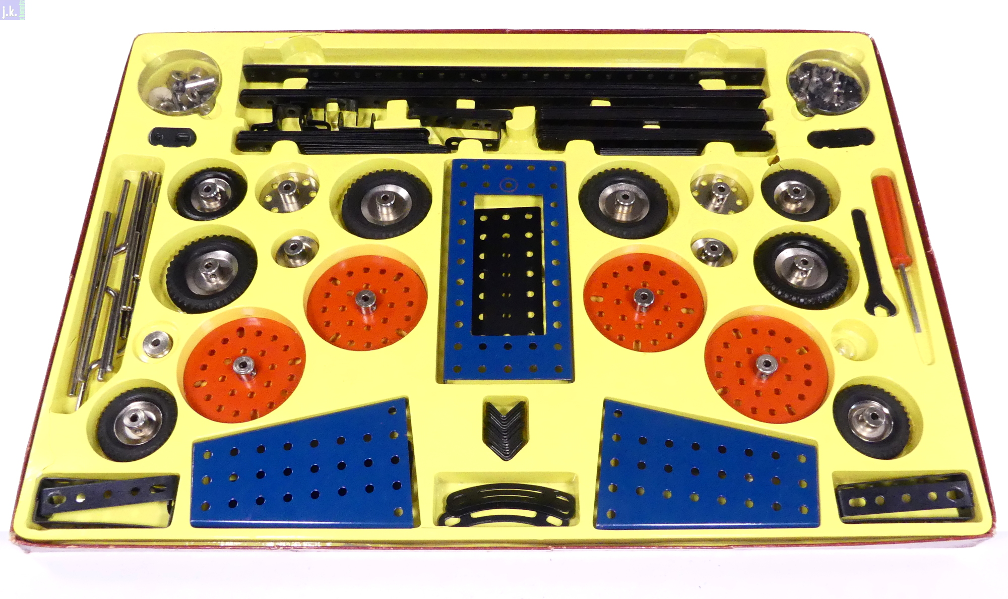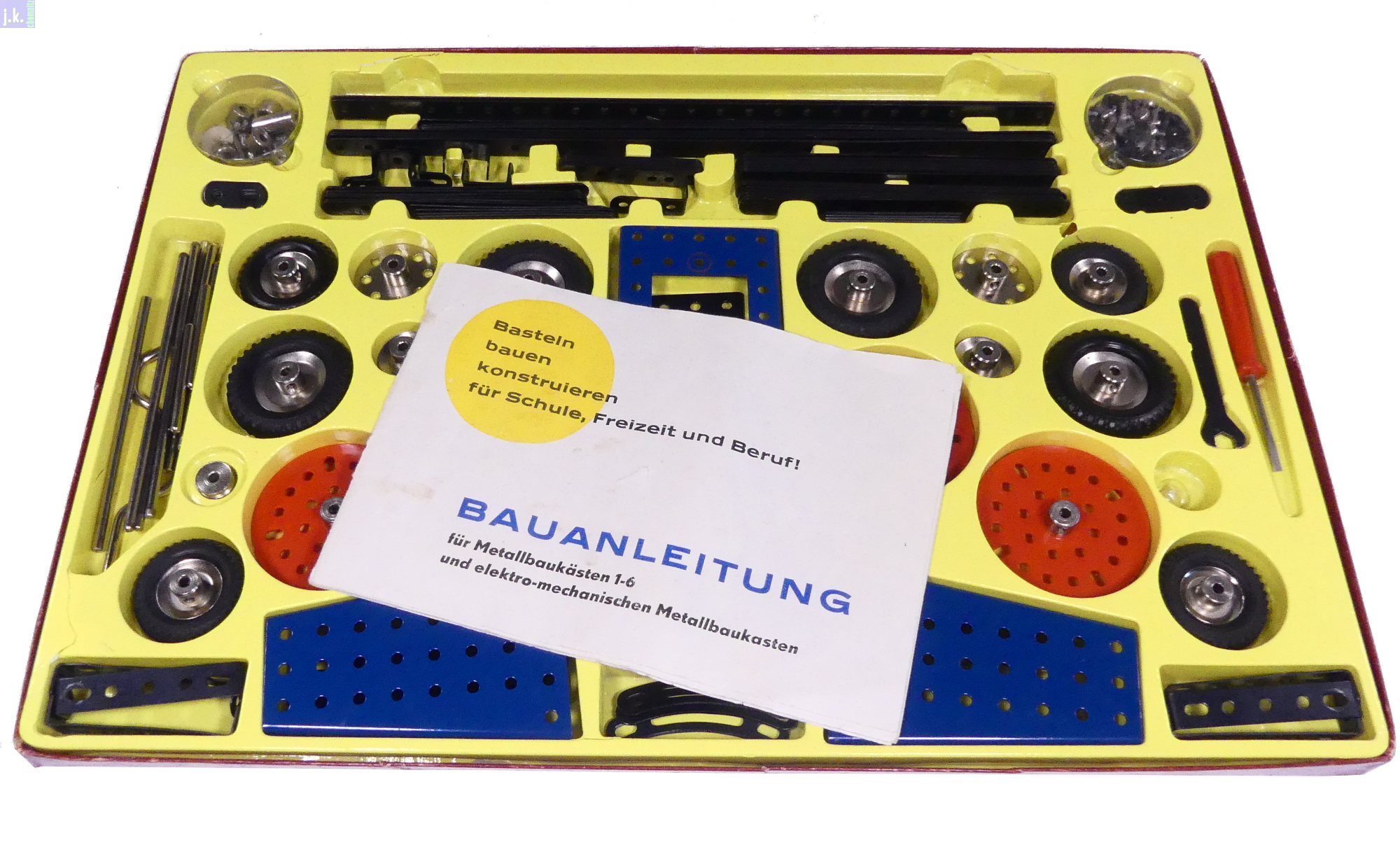 Zustand: Leicht bespielt, bis auf die fehlenden Schrauben und Muttern vollständig aufgefüllt (4 Teile). Vorlagenheft stark benutzt. Eine Deckelecke repariert. Tiefzieheinsatz mit diversen Rissen.