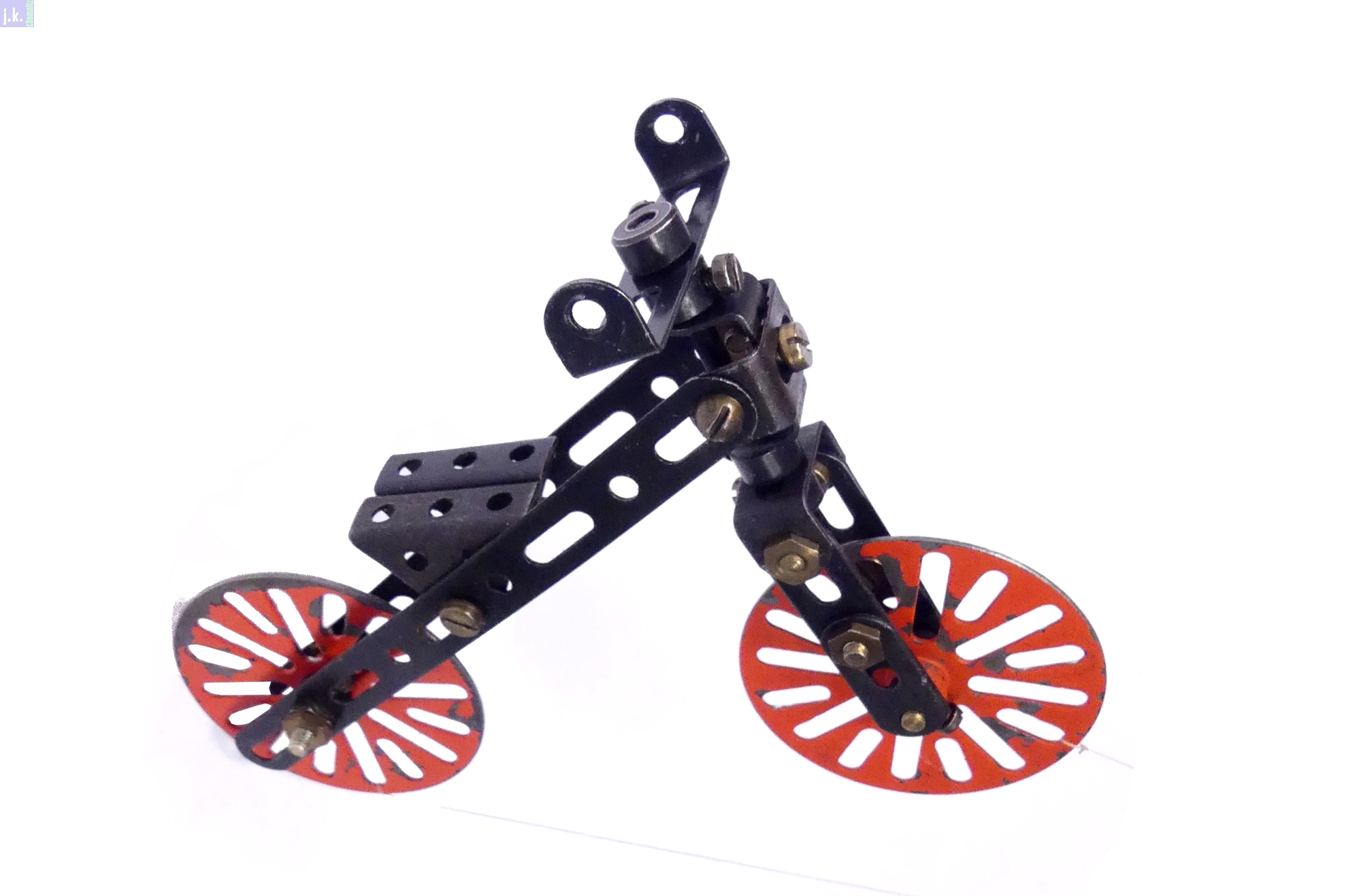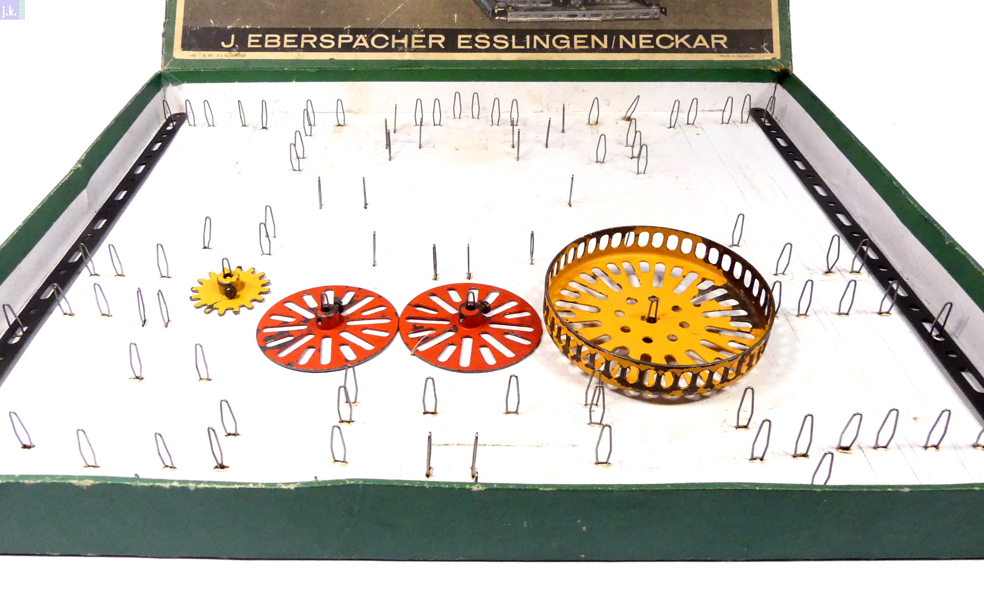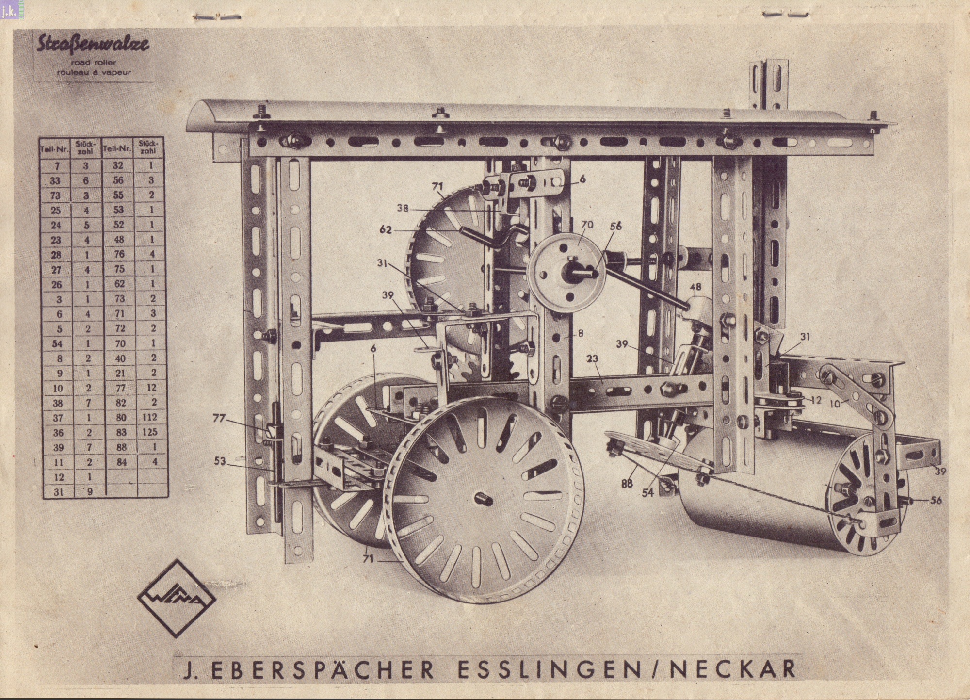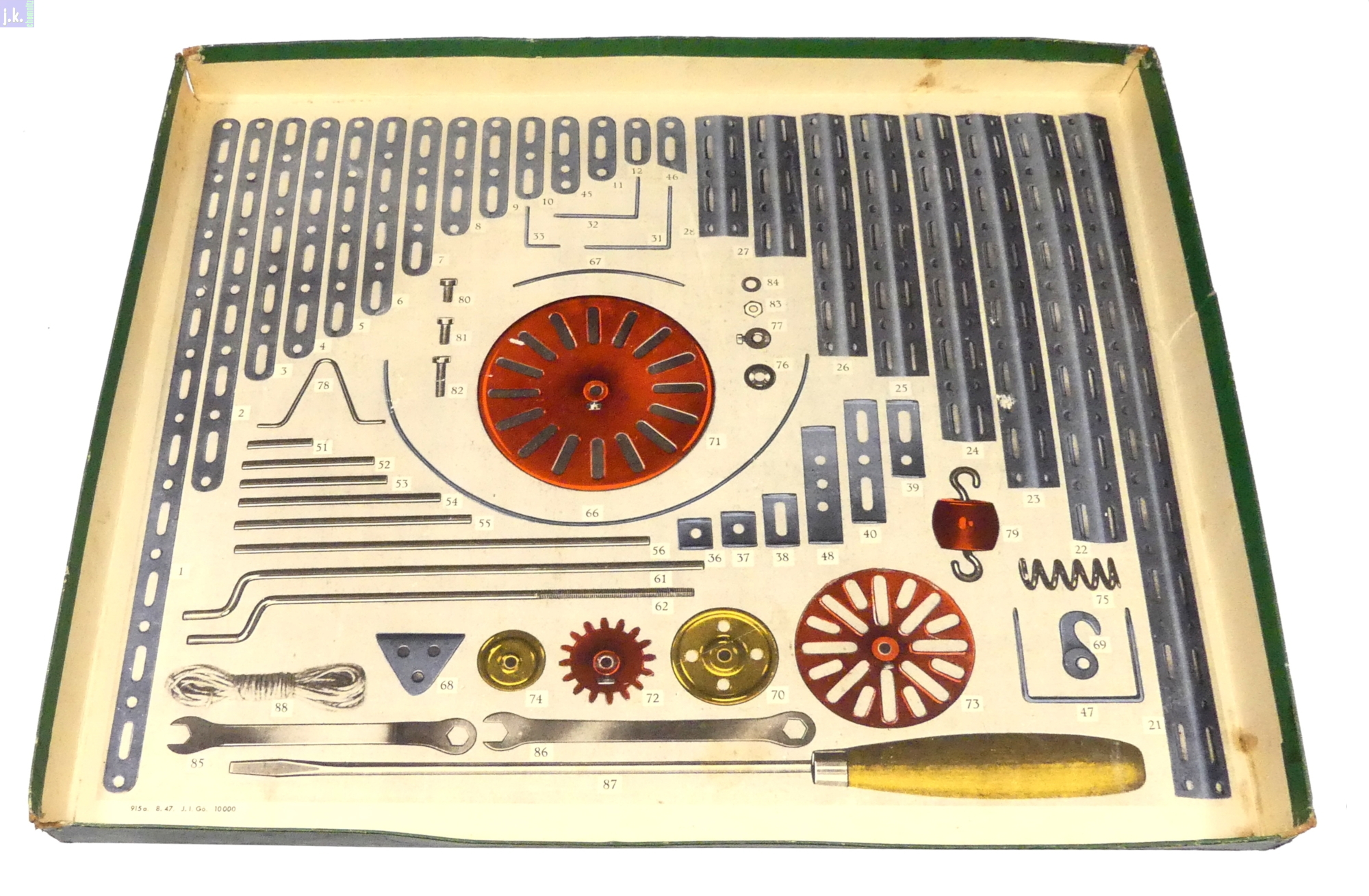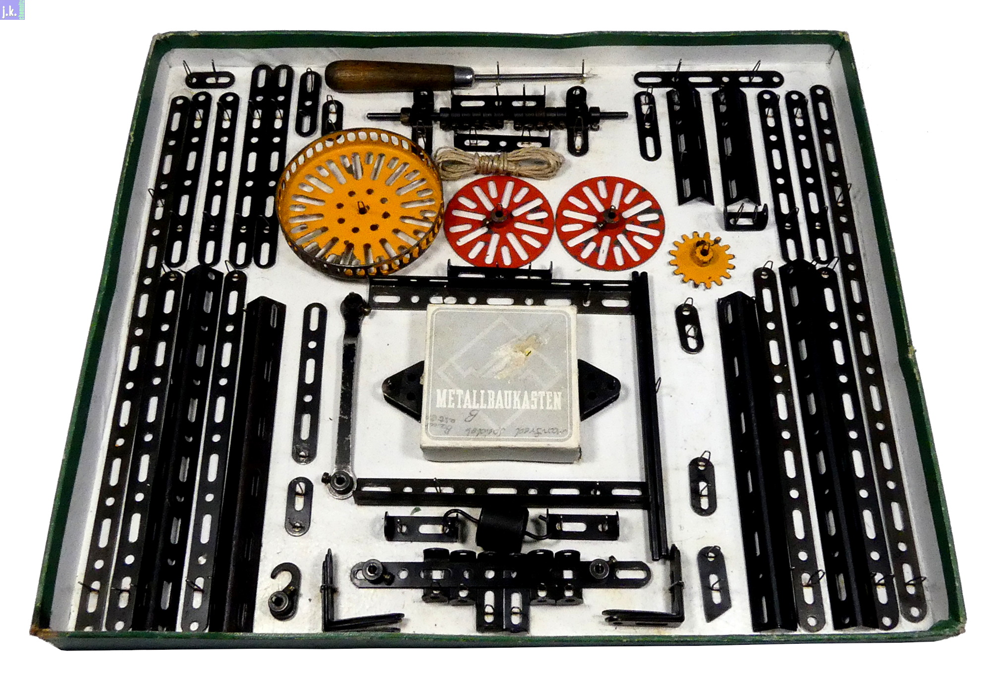 Bemerkungen Baukasten aus hochwertig brünierten Stahlblechteilen und farbig lackierten Rädern. Der Wechsel von Rund- und Langlöchern bei den Flachbändern und Winkelträgern gibt vor allem Gerüstbauten, Brücken u. ä. ein realistischeres Aussehen als bei reinen Rundlochbändern.