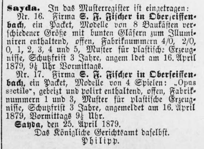 wurden von E. Reuter und wenig später von L. Engel die ersten Baukästen mit trommelpolierten Bausteinen auf den Markt gebracht. Die Firmen waren damit nahezu konkurrenzlos auf dem Weltmarkt und erzielten sehr gute Umsätze.