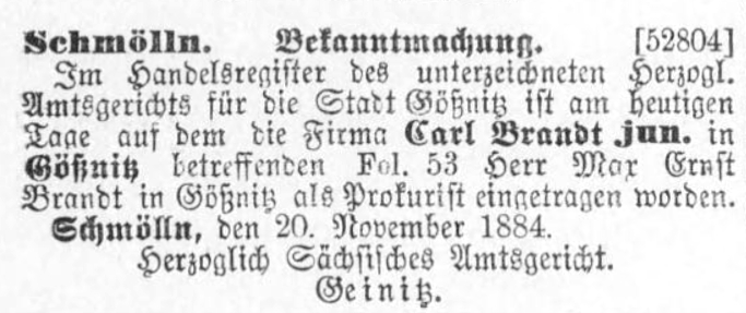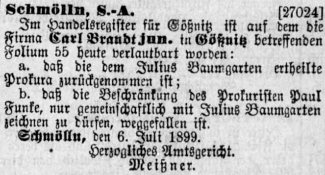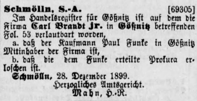 Eintrag im Deutschen Reichs- und Staatsanzeiger Nr. 82 vom 6. April 1924. Offensichtlich nach Insolvenz wird die GmbH in eine oHG umgewandelt