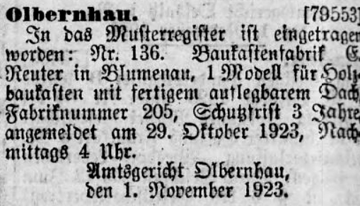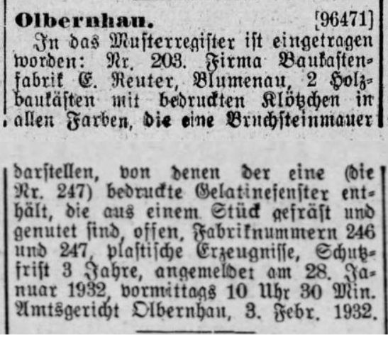wurden von E. Reuter und wenig später von L. Engel die ersten Baukästen mit trommelpolierten Bausteinen auf den Markt gebracht. Die Firmen waren damit nahezu konkurrenzlos auf dem Weltmarkt und erzielten sehr gute Umsätze.