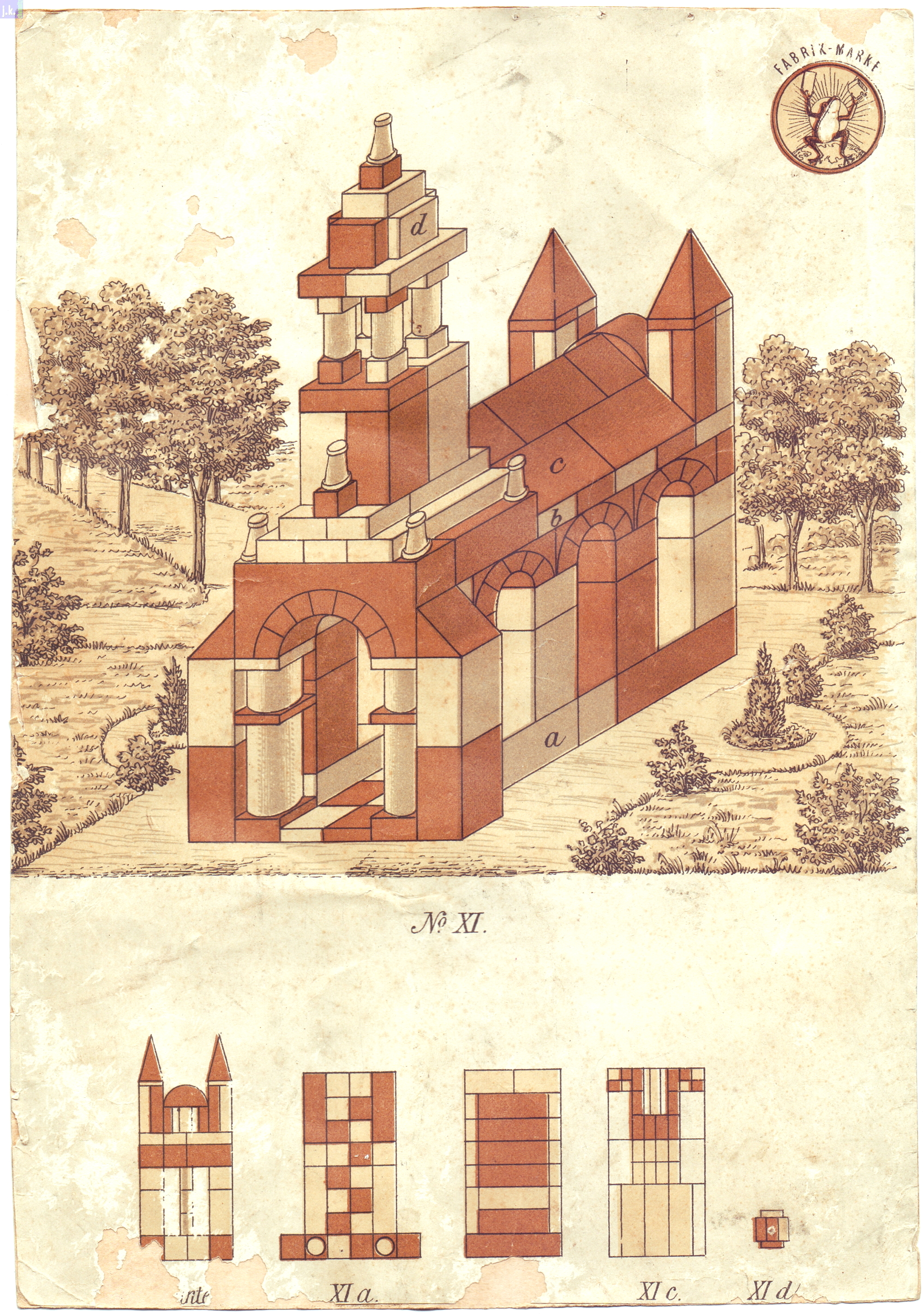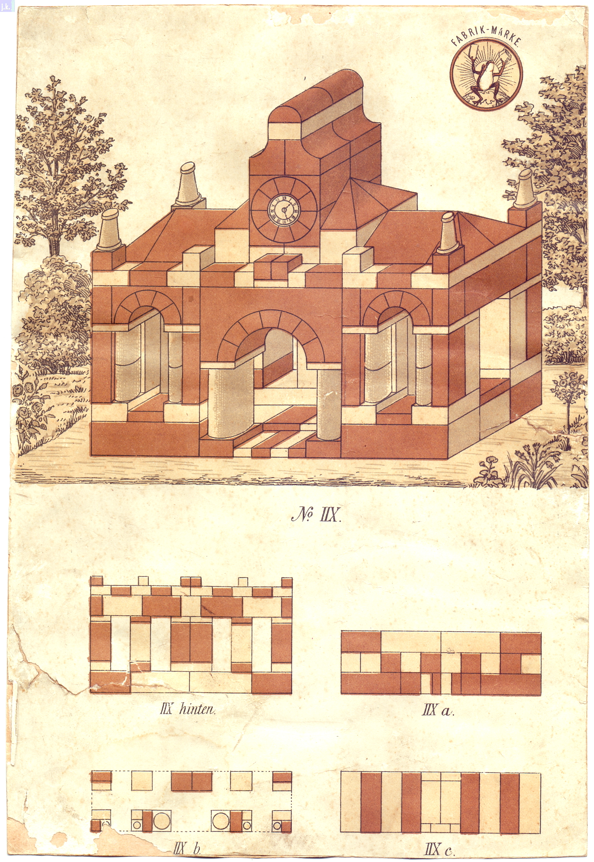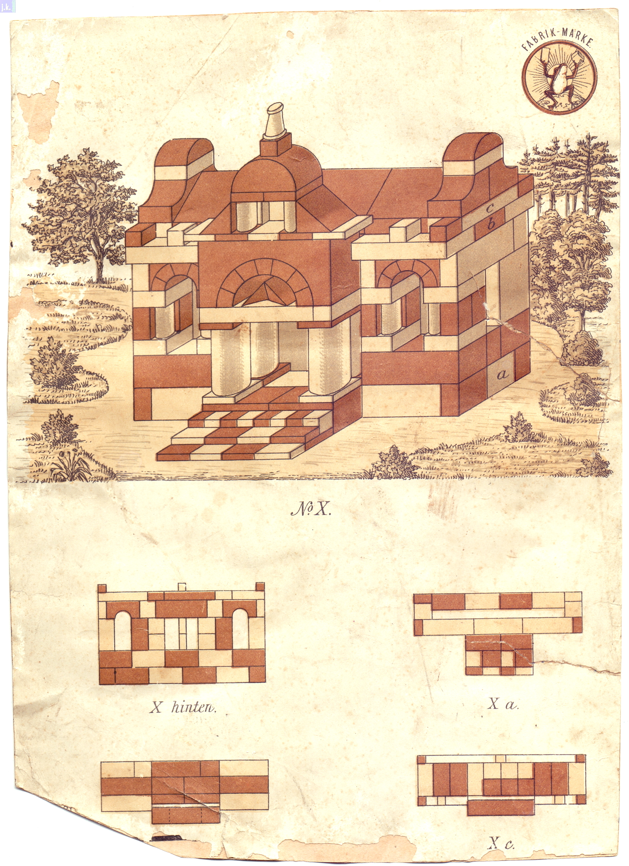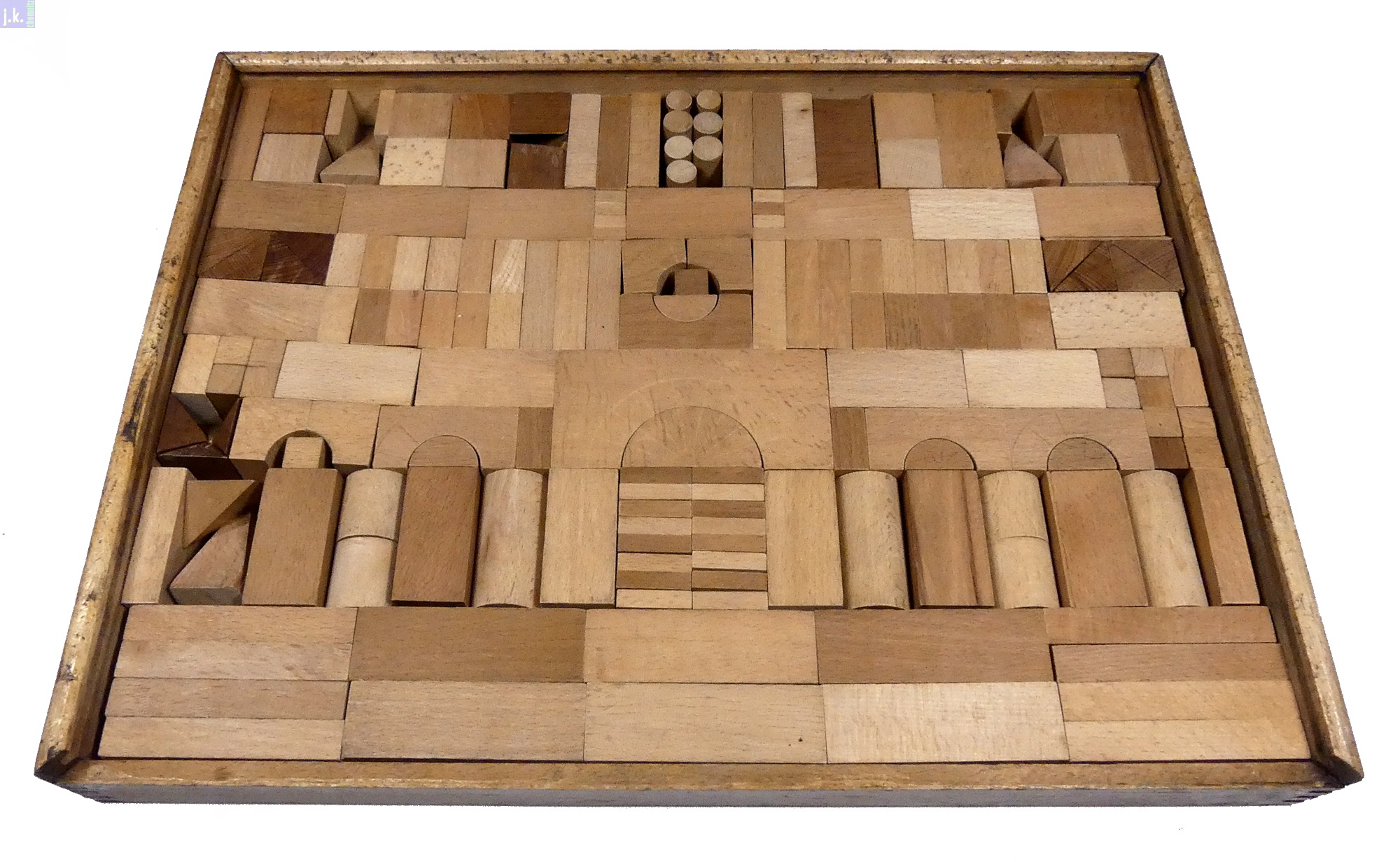 Sehr großer Baukasten aus naturbelassenen und gedämpften Buchenholzsteinen in hoher Bearbeitungsqualität. Auffallend ist die große Ähnlichkeit zum Baukasten Der Baumeister im Kindergarten von S. F. Fischer aus der gleichen Zeit. Selbst die Vorlagen könnte man ohne die jeweilige Fabrikmarke verwechseln, und auch zwei verschiedene Rastermaße (hier 20 und 30 mm) hat jedes der Systeme.