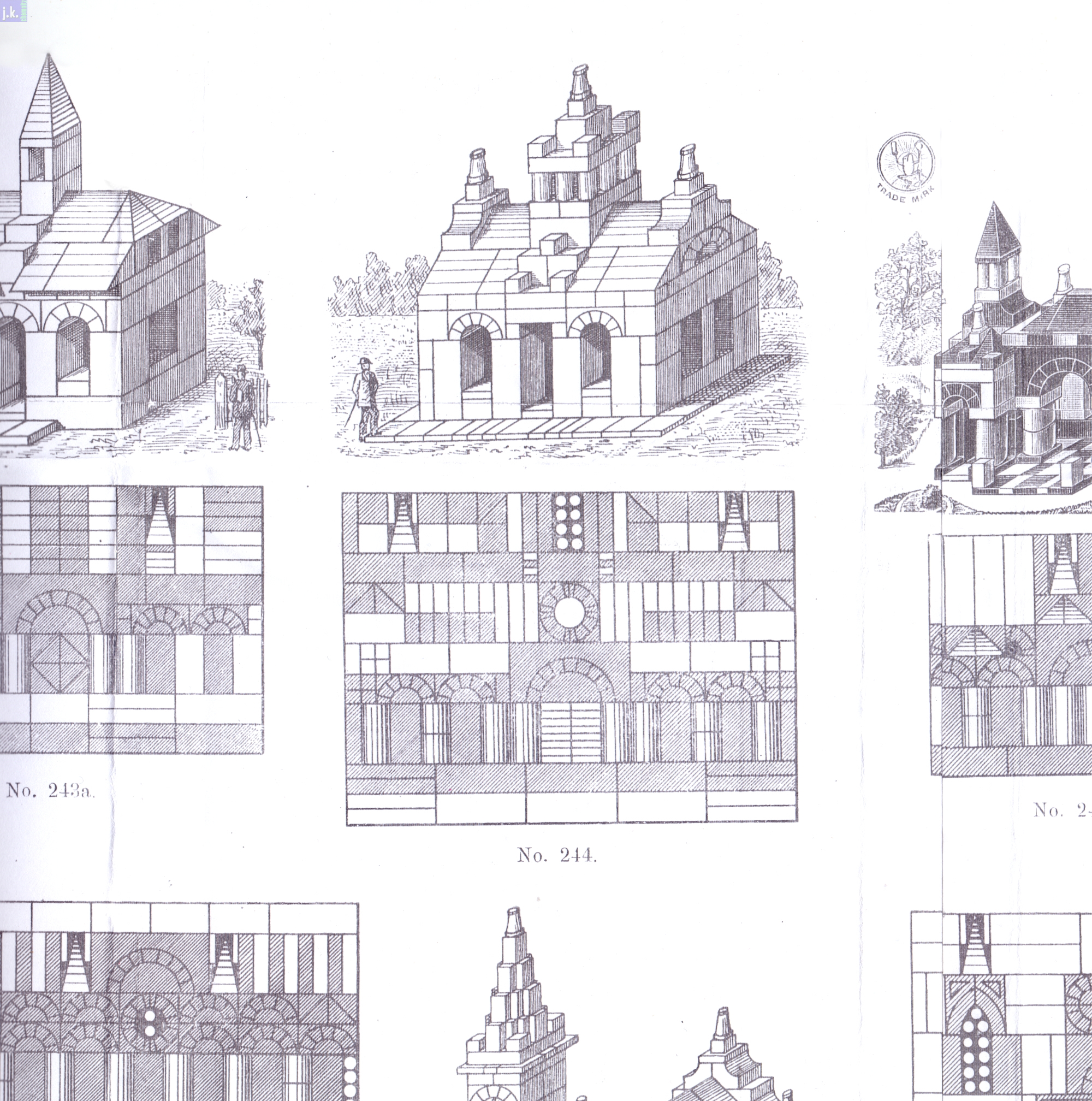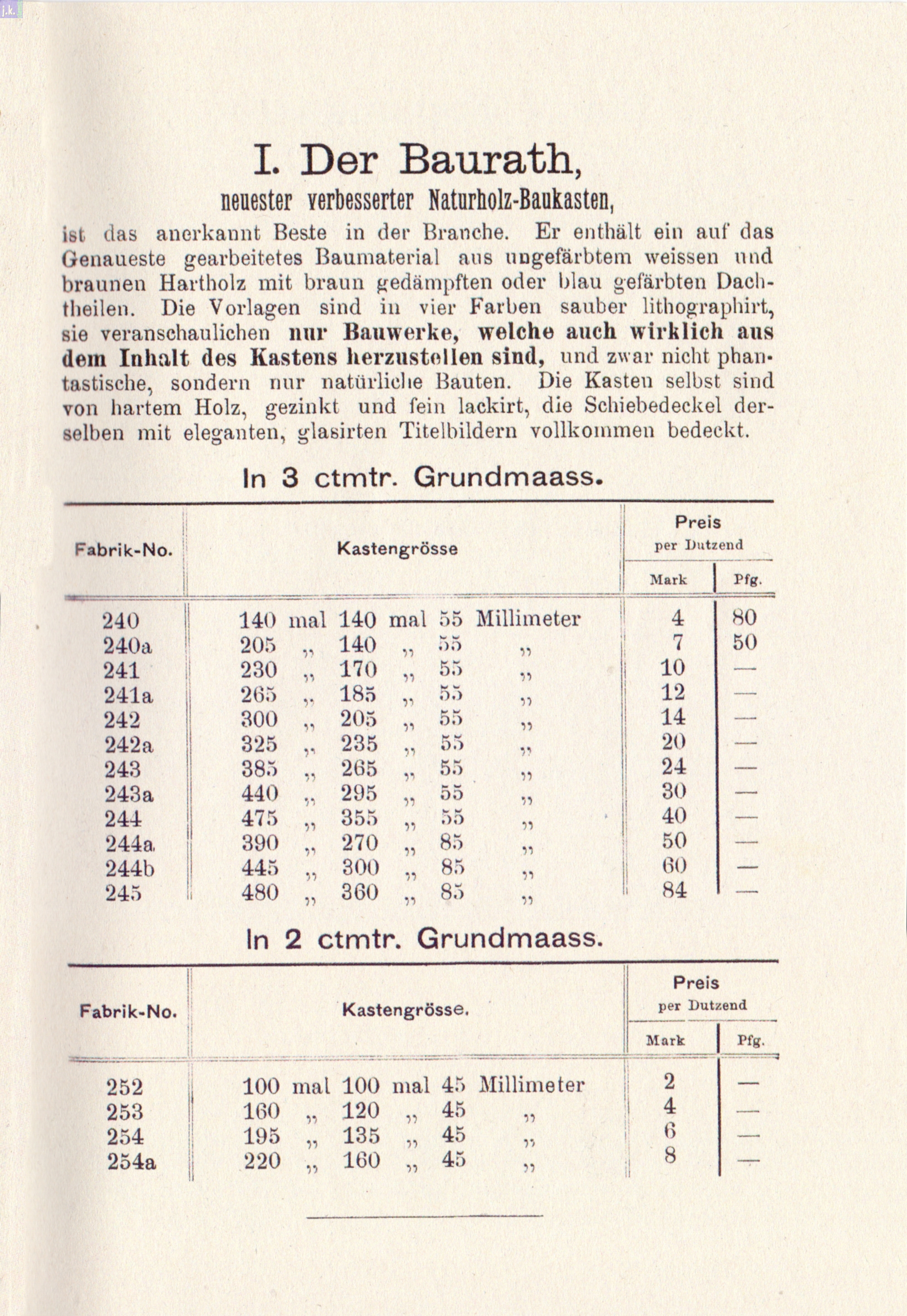 Der Kasten ist in einem Katalog um 1890 als Kat.Nr. 244 enthalten ( Bild 7). Da der hier gezeigte Kasten noch die Größenangabe 'Ausgabe III' trägt, dürfte er noch einige Jahre älter sein. Das System ist (wie sonst nur bei Metallbaukästen üblich aber auch in dem o.a. Fischer-System) in Grund- und Ergänzungskästen eingeteilt (Bild 7).