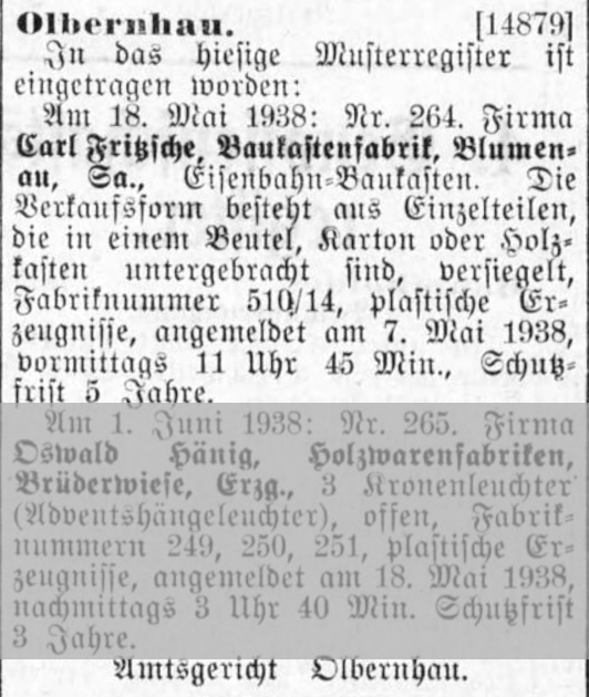 Den Blumenauer Holzbaukasten-Firmen Louis Engel, Carl Fritzsche, E. Reuter, Gotthard Drechsel und Karl Louis Neubert. Auch der einst im nicht weit von Olbernhau/Blumenau entfernt gelegenen Seiffen/Oberseiffenbach ansässigen Firma S. F. Fischer gilt ein besonderes Interesse.