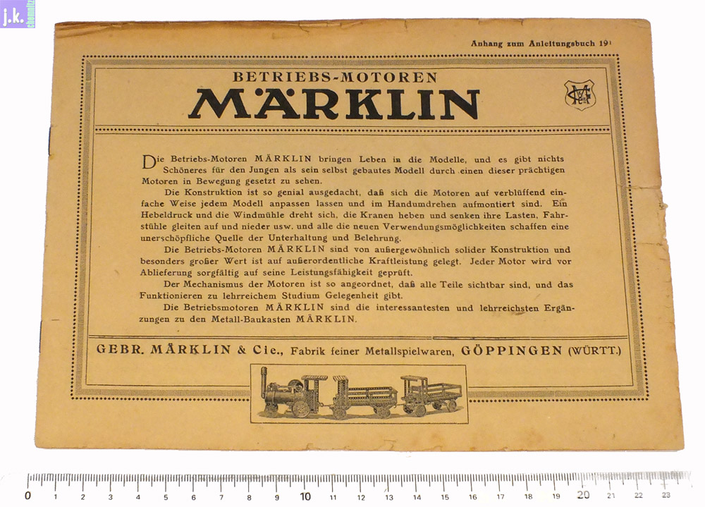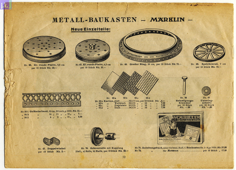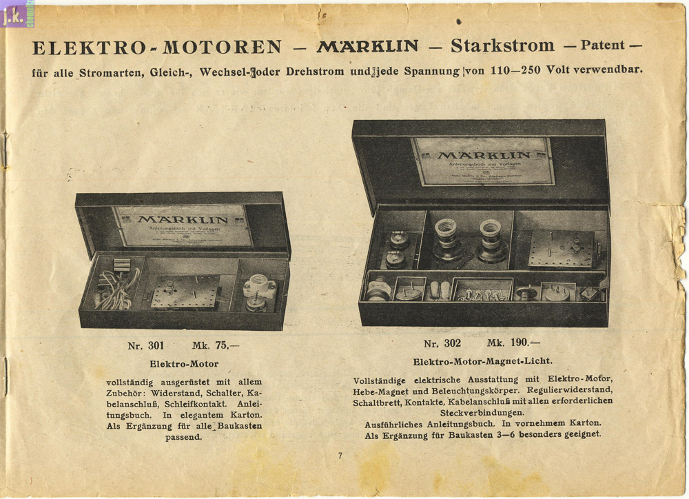 Bemerkenswert ist die 12-seitige Beilage 'Betriebs-Motoren Märklin'. Bild 4 zeigt die Seite 7 der Beilage mit den Elektro-Kästen 301 und 302. Interessant der E-Motor, der seinerzeit den äußerlich gleichen Aufbau hatte wie der kleine Feder-Motor (auch in Anleitungsbüchern Nr. 71 zu sehen). Bild 5 zeigt die neuen Teile der Märklin-Baukästen, darunter die Kleine runde Platte No. 67.