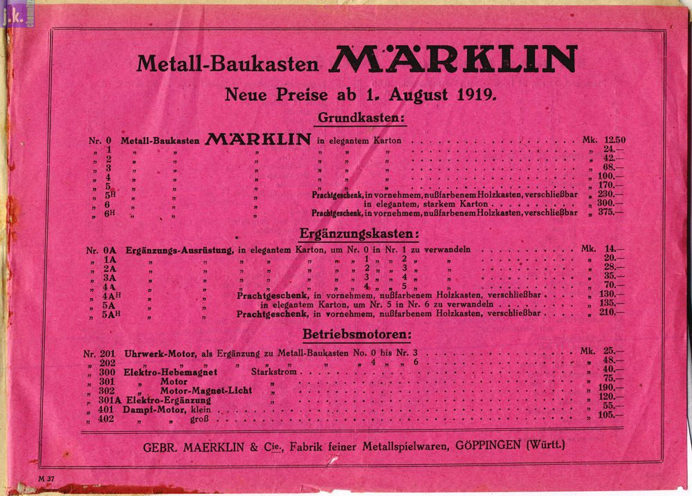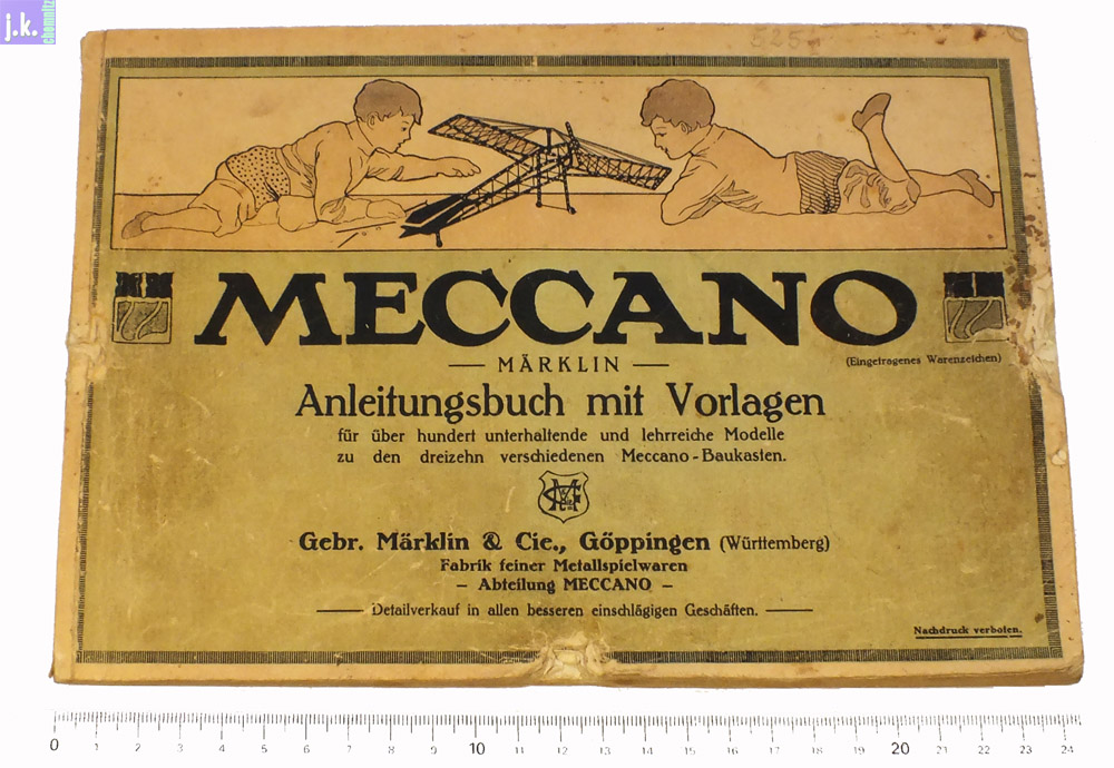 Anleitungsbuch mit 112 Seiten, halbe Seite 111/112 fehlt ebenso wie der Rückdeckel. Keine Markung. Es handelt sich um eine Ausgabe, die eigentlich dem Teilebestand nicht entspricht. So gibt es eben keine Modelle mit der runden Platte, Teil No. 67. Nach Seite 110 ist das in Bild 2 gezeigte rote Blatt mit einer Preisliste ab August 1919 für die Baukästen auf der Vorderseite und für die Einzelteile auf der Rückseite eingeklebt (Markung 70317).
