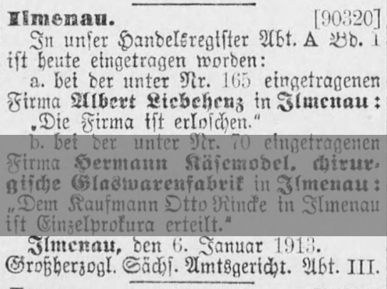 Eintrag im Deutschen Reichs- und Staatsanzeiger Nr. 82 vom 6. April 1924. Offensichtlich nach Insolvenz wird die GmbH in eine oHG umgewandelt