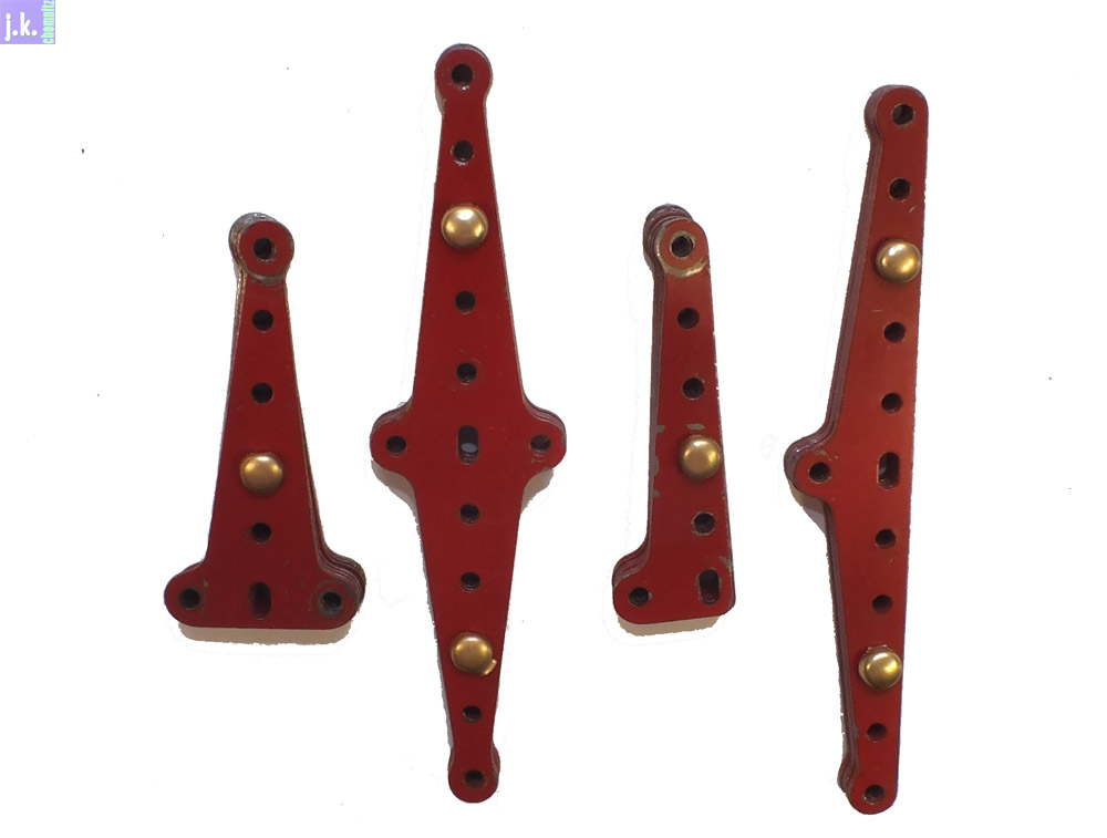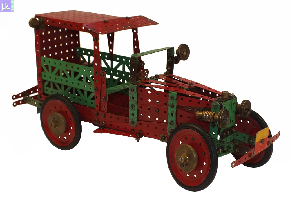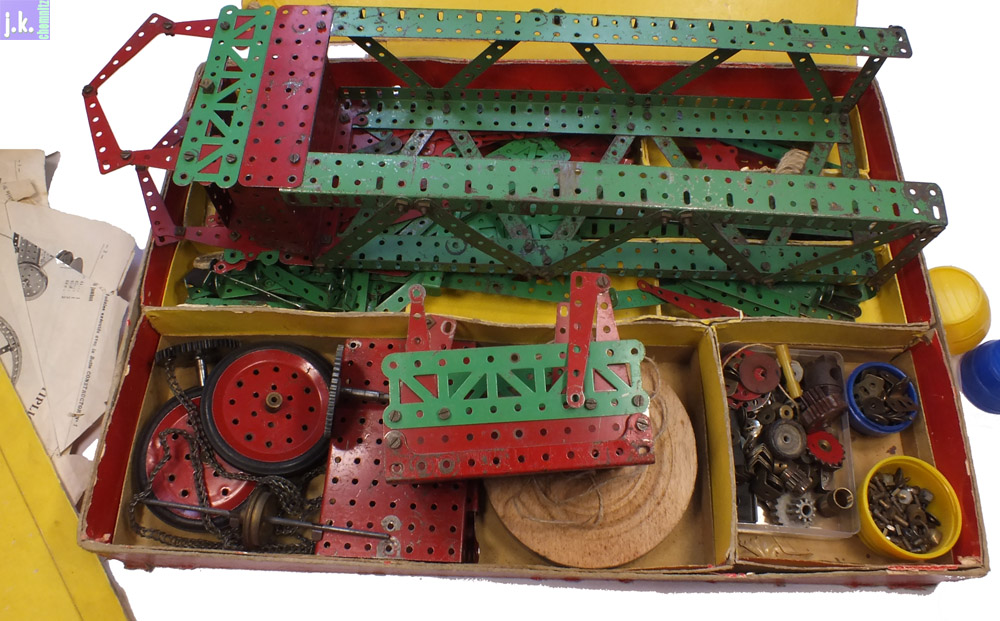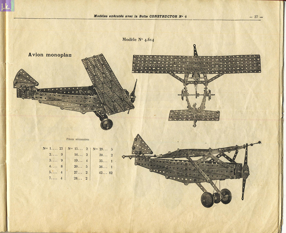 Der Kasten enthält eine große Zahl rautenähnlicher Teile (Bild 1), die zusammen mit halben und Viertel-Rauten zu Flächen oder Wölbungen verbaut werden können, wie z. B. das Automodell (Bild 2) und die Vorlage für ein Flugzeug (Bild 4) zeigen. Aber auch Konstruktionsteile für Maschinen wie sie bis in die 1950er hinein gestaltet wurden lassen sich damit gut nachbilden.