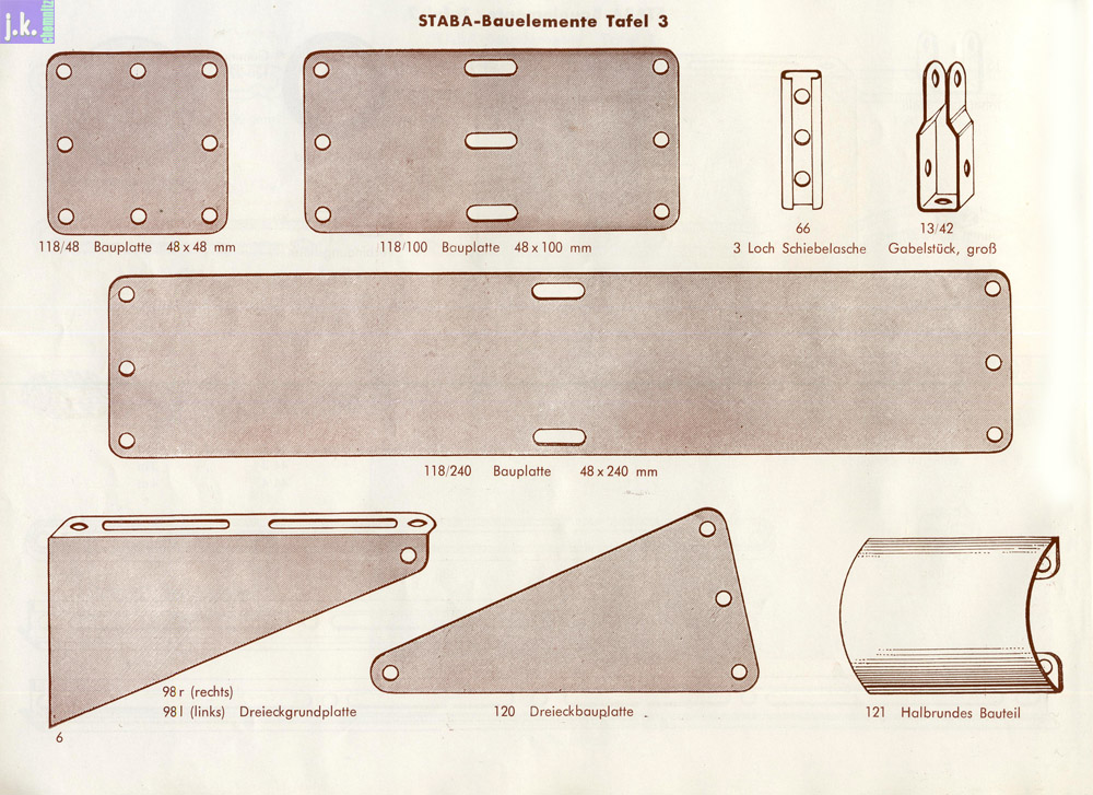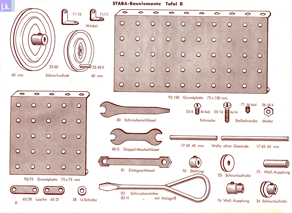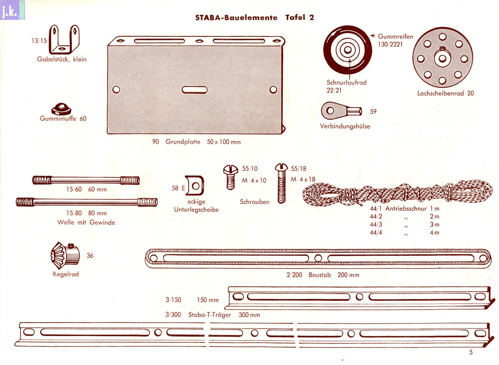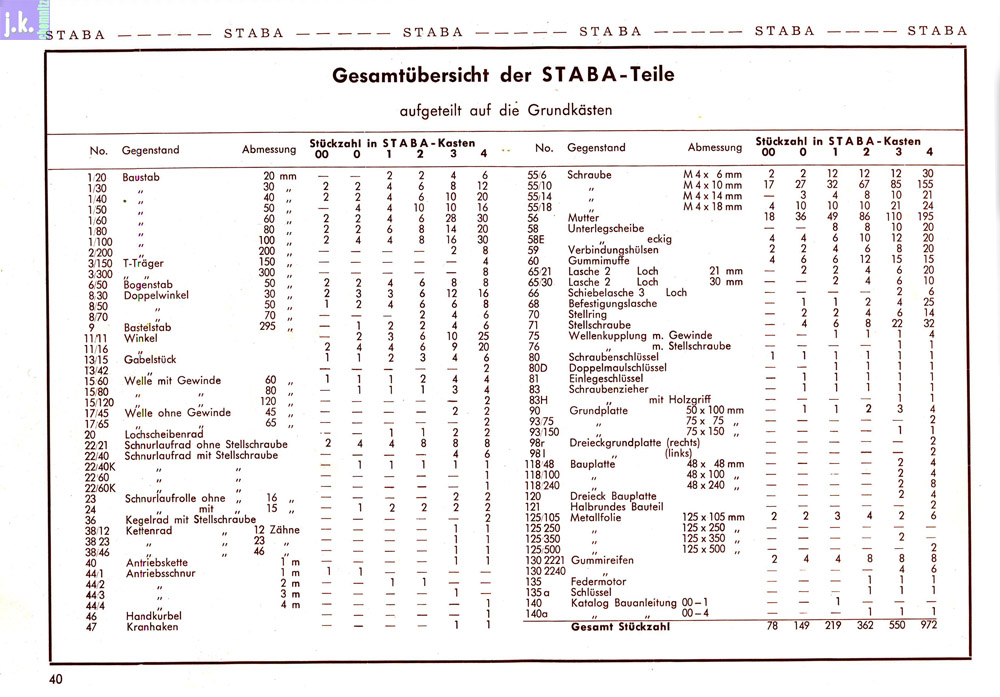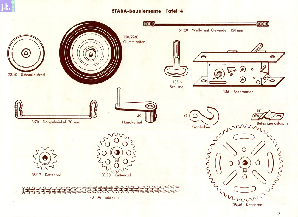 Das System verfügt über eine erstaunliche Teilevielfalt von über 70 Teilearten, die man nicht erwartet, wenn man z. B. nur den kleinsten Kasten 00 kennt (Bilder 1 bis 5). Auch ein Federmotor ist dabei. Beträchtlich auch die Teilezahl, z. B. fast 1000 für die größte Ausrüstung 4 (Bild 6).