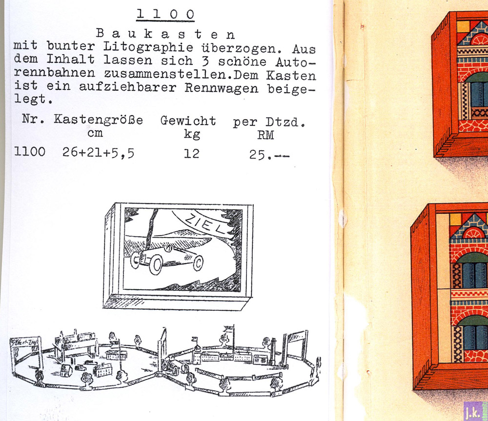 Preisliste M Louis Engel & Co. Händler/Grossisten-Preisliste, Louis Engel & Co. Baukasten- und Holzspielwarenfabrik, Blumenau i.Sa., ohne Firmenangabe, ohne Druckereiangabe, ohne Datierung, 8 beidseitig bedruckte Doppelseiten (= 32 Seiten in der früheren Heftung), nur an den L-Deckel geheftet, M handschriftlich aufgebracht, 11 cm x 29 cm (Kopie)